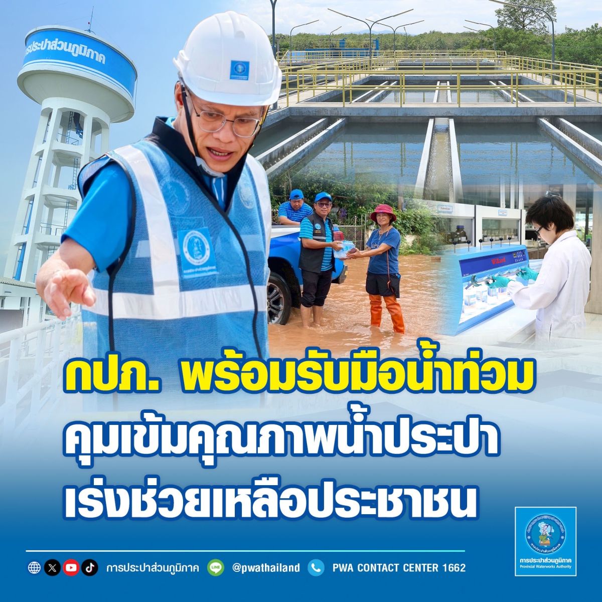 ผู้ว่าการ กปภ. กล่าวเพิ่มเติมว่า กปภ. ได้เตรียมมาตรการเร่งด่วนในการช่วยเหลือประชาชนที่ได้รับผลกระทบจากอุทกภัย โดยจัดเตรียมน้ำดื่มสะอาดบรรจุขวดตราสัญลักษณ์ กปภ. และรถบรรทุกน้ำเพื่อแจกจ่ายน้ำสะอาดให้บริการประชาชน พร้อมทั้งจะประสานความร่วมมือกับหน่วยงานในพื้นที่สนับสนุนความช่วยเหลือด้านต่าง ๆ ตามนโยบายของนายภูมิธรรม เวชยชัย รองนายกรัฐมนตรี และรัฐมนตรีว่าการกระทรวงมหาดไทยอย่างเต็มกำลัง อย่างไรก็ตาม แนะนำประชาชนเก็บสำรองน้ำประปาไว้ใช้ ยกของขึ้นที่สูง ติดตามข่าวสารอย่างใกล้ชิด พร้อมรับมือสถานการณ์ฉุกเฉินที่อาจเกิดขึ้นจากน้ำท่วม ทั้งนี้ หากประชาชนในพื้นที่ประสบอุทกภัยต้องการความช่วยเหลือ สามารถติดต่อหรือสอบถามข้อมูลเพิ่มเติม ได้ที่ PWA Contact Center 1662 ตลอด 24 ชั่วโมง