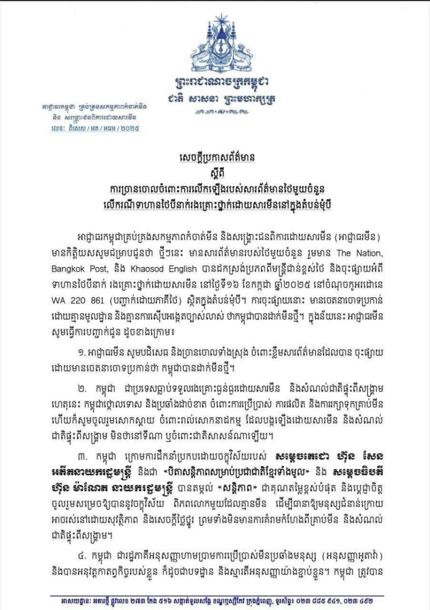 สำนักงานปฏิบัติการทุ่นระเบิดและช่วยเหลือผู้ประสบภัยจากทุ่นระเบิดแห่งชาติกัมพูชา (สำนักงานทุ่นระเบิด) ขอแจ้งว่า เมื่อไม่นานมานี้ มีสื่อมวลชนไทยจำนวนหนึ่ง ได้อ้างอิงแหล่งข้อมูลจากข้าราชการระดับสูงของไทย และ เผยแพร่เกี่ยวกับทหารไทยสามนายได้รับบาดเจ็บจากระเบิด เมื่อวันที่ 16 กรกฎาคม 2568 บริเวณ พิกัด WA 220861 (ยืนยันโดยฝ่ายไทย) อยู่ในพื้นที่มุมเบ็ย (ช่องบก) การเผยแพร่ดังกล่าว มีเจตนา กล่าวหาโดยไม่มีมูลความจริงและไม่มีการตรวจสอบที่ชัดเจนว่ากัมพูชาได้วางทุ่นระเบิดใหม่ ในการนี้สำนักงานทุ่นระเบิด ขอชี้แจงดังนี้