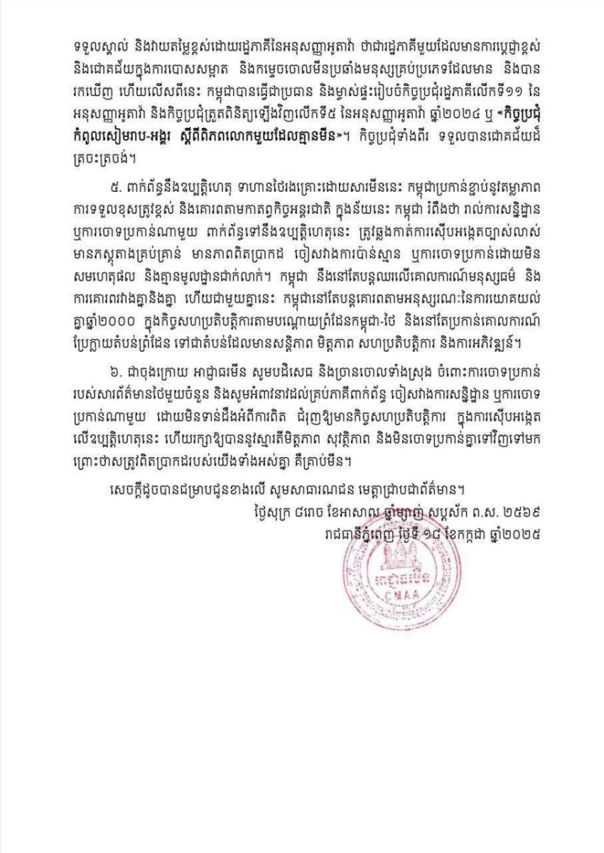 5. เกี่ยวกับเหตุการณ์ที่ทหารไทยได้รับบาดเจ็บจากทุ่นระเบิดนี้ กัมพูชายึดมั่นในความโปร่งใส ความรับผิดชอบสูง และการเคารพพันธกรณีระหว่างประเทศ ในบริบทนี้ กัมพูชา คาดหวังว่าในการ สันนิษฐาน หรือ การกล่าวหาใดๆ ที่เกี่ยวข้องกับเหตุการณ์นี้ จะต้องผ่านการตรวจสอบที่ชัดเจน มีหลักฐานเพียงพอ มีความเป็นจริง หลีกเลี่ยงการคาดเดา หรือการกล่าวหาที่ไม่มีเหตุผลและไม่มีมูล ความจริงที่ชัดเจน กัมพูชายังคงยึดมั่นในหลักมนุษยธรรมและการเคารพซึ่งกันและกัน ขณะเดียวกัน กัมพูชายังคงปฏิบัติตามบันทึกความเข้าใจร่วมปี 2543 ในความร่วมมือตามแนวชายแดนกัมพูชา-ไทย และจะยังคงยึดมั่นในหลักการที่จะเปลี่ยนพื้นที่ชายแดนให้เป็นพื้นที่ที่มีสันติภาพ มิตรภาพ ความร่วมมือ และการพัฒนา