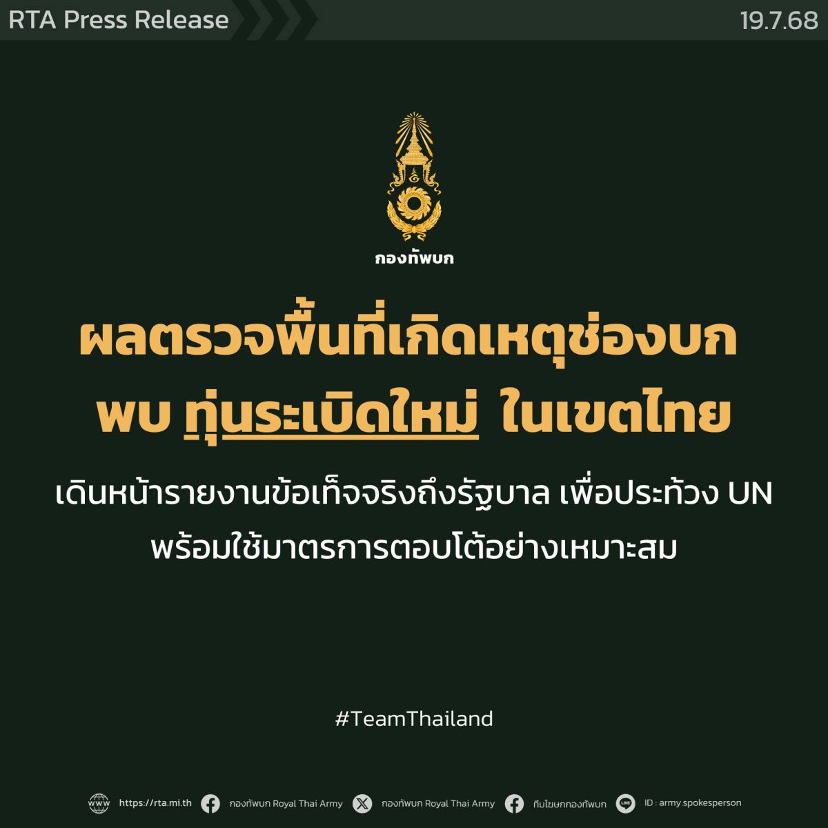 วันนี้ (19 ก.ค. 2568) พลตรี วินธัย สุวารี โฆษกกองทัพบก ได้เปิดเผยถึงสถานการณ์ภายหลังเกิดเหตุการณ์กำลังพลได้รับบาดเจ็บจากทุ่นระเบิด ระหว่างปฏิบัติลาดตระเวนในพื้นที่ชายแดนช่องบก จังหวัดอุบลราชธานี และจากการที่พลโท บุญสิน พาดกลาง แม่ทัพภาคที่ 2 ได้ออกมาชี้แจงผลการตรวจสอบพื้นที่เกิดเหตุโดย นปท.3 ที่ระบุว่ามีวางทุ่นระเบิดใหม่ จำนวน 8 ทุ่น ในพื้นที่เขตแดนไทย ซึ่งขัดต่ออนุสัญญาออตตาวา ว่าด้วยการห้ามใช้ทุ่นระเบิดสังหารบุคคล แม้ทางฝ่ายกัมพูชาจะไม่ยอมรับ แต่หน่วยจะรายงานข้อเท็จจริงถึงกองทัพบกและรัฐบาล เพื่อประท้วงผ่าน UN ต่อไป พร้อมเตรียมส่งทหารเข้าตรวจพื้นที่ และเก็บกู้ตลอดแนวชายแดน ควบคู่ไปกับใช้การมาตรการตอบโต้ทางทหารอย่างเหมาะสม