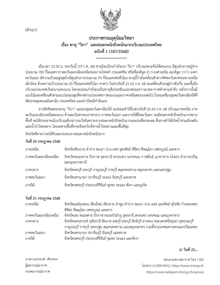 พายุ "วิภา" และฝนตกหนักถึงหนักมากบริเวณประเทศไทย ฉบับที่ 1 (187/2568)