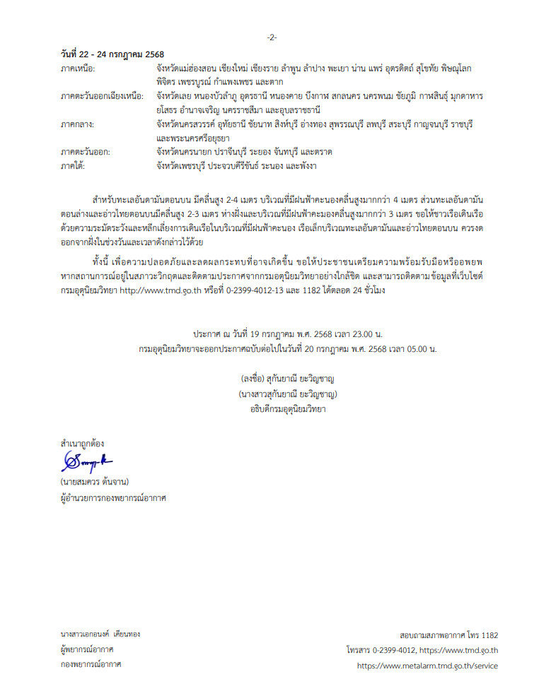 กรมอุตุนิยมวิทยาจะออกประกาศฉบับต่อไปในวันที่ 20 กรกฎาคม พ.ศ. 2568 เวลา 05.00 น.