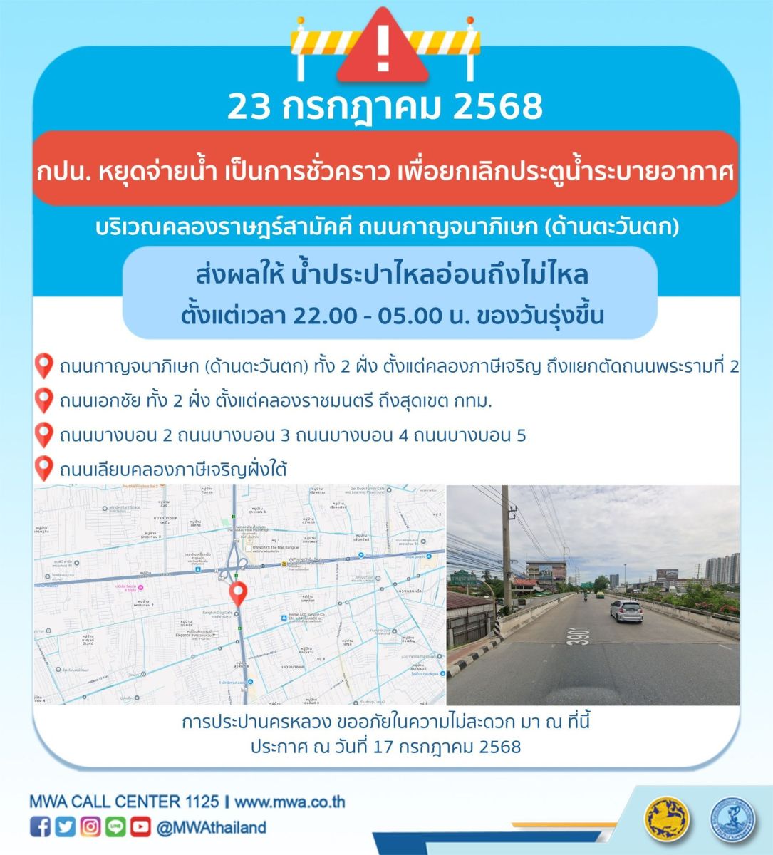 การประปานครหลวง (กปน.) ขอแจ้งให้ทราบว่า จะดำเนินการยกเลิกประตูน้ำระบายอากาศ ในพื้นที่บริเวณคลองราษฎร์สามัคคี ถนนกาญจนาภิเษก (ด้านตะวันตก) เพื่อให้ประชาชนได้รับบริการน้ำประปาอย่างเพียงพอและทั่วถึง จึงมีความจำเป็นต้องหยุดจ่ายน้ำ เป็นการชั่วคราว ในคืนวันพุธที่ 23 กรกฎาคม 2568 ตั้งแต่เวลา 22.00 - 05.00 น. ของวันรุ่งขึ้น โดยระหว่างดำเนินการ ส่งผลให้ น้ำประปาไหลอ่อนถึงไม่ไหล ในพื้นที่ดังต่อไปนี้
