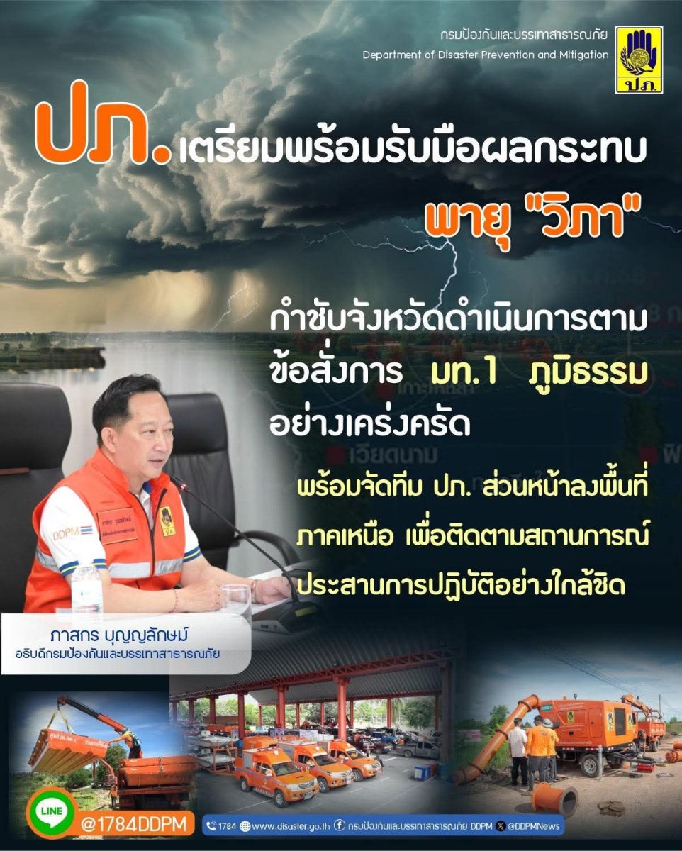 ปภ. เตรียมรับผลกระทบพายุ "วิภา" กำชับจังหวัดดำเนินการตามข้อสั่งการ มท.1 ภูมิธรรม - ทีม ปภ.ส่วนหน้าลงพื้นที่เชียงใหม่เย็นนี้ ติดตามสถานการณ์ – ประสานการปฏิบัติอย่างใกล้ชิด