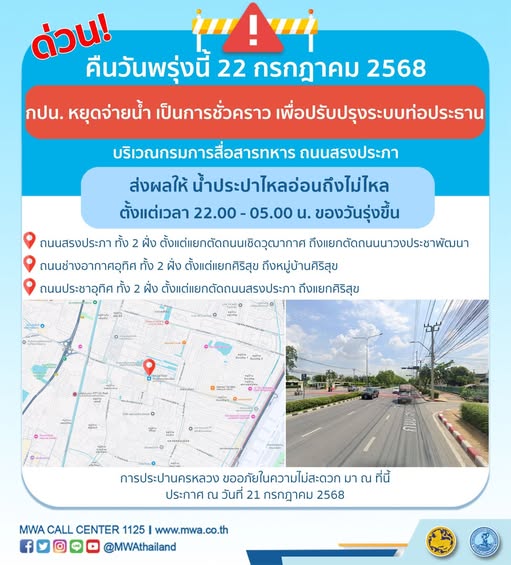 การประปานครหลวง (กปน.) ขอแจ้งให้ทราบว่า จะดำเนินการปรับปรุงระบบท่อประธาน ในพื้นที่บริเวณกรมการสื่อสารทหาร ถนนสรงประภา เพื่อให้ประชาชนได้รับบริการน้ำประปาอย่างเพียงพอและทั่วถึง จึงมีความจำเป็นต้องหยุดจ่ายน้ำ เป็นการชั่วคราว ในคืนวันพรุ่งนี้ (วันอังคารที่ 22 กรกฎาคม 2568) ตั้งแต่เวลา 22.00 - 05.00 น. ของวันรุ่งขึ้น โดยระหว่างดำเนินการ ส่งผลให้ น้ำประปาไหลอ่อนถึงไม่ไหล ในพื้นที่ดังต่อไปนี้