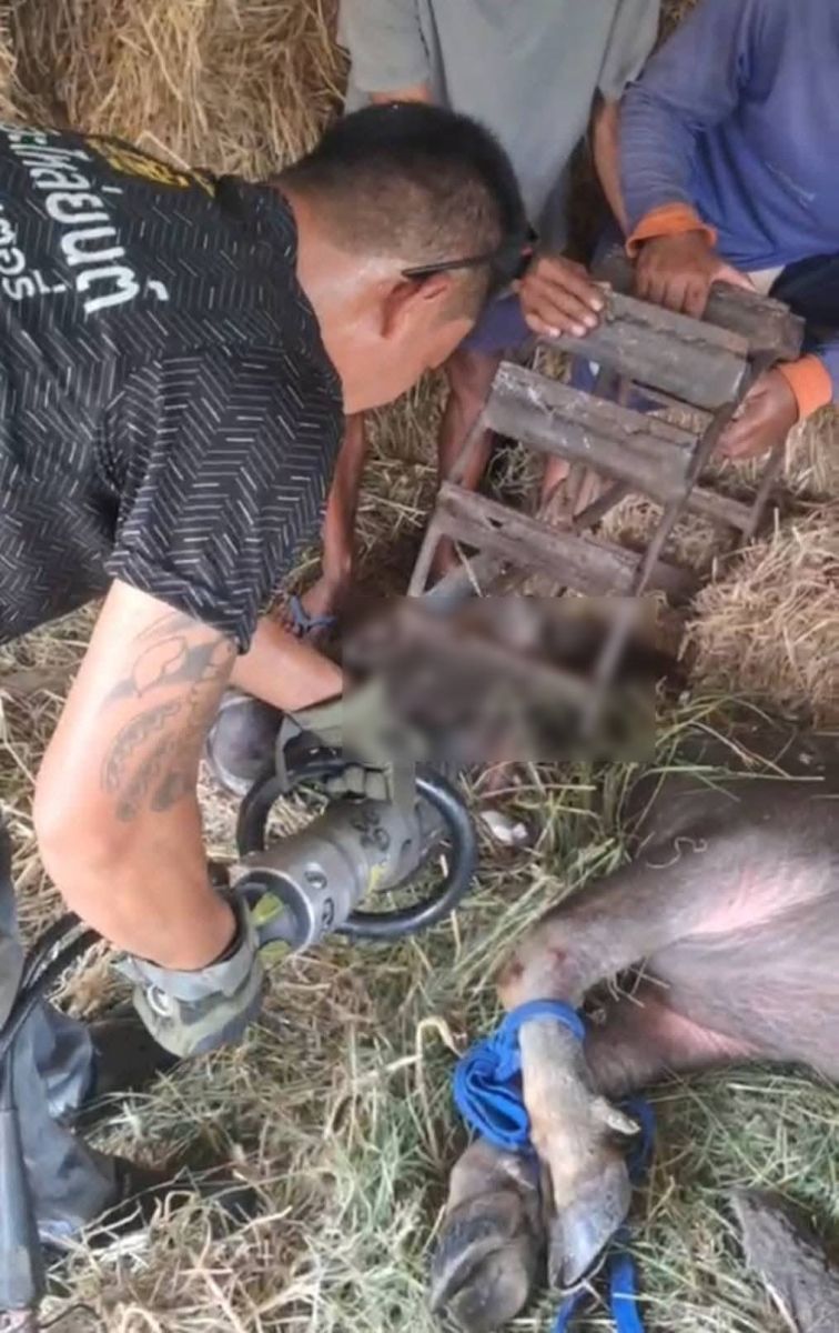 วันที่ 21 กรกฎาคม 2568 ได้รับแจ้งจาก หน่วยกู้ภัยสว่างจรรยาธรรม นำเครื่องตัดถ่างเข้าไปช่วยเหลือ “เจ้าสมหวัง” ควายอายุ 2 ปี ที่หัวเข้าไปอยู่ในล้อรถไถนานกว่า 2 ชม. ที่บ้าน ต.โคกขมิ้น อ.พลับพลาชัย จ.บุรีรัมย์ โดยเจ้าของบ้าย เผยว่า ได้ถอดล้อรถไถแบบเดินตาม พิงไว้กับเสาโรงเก็บฟางและหญ้า คาดควายน่าจะเดินไปหากินหญ้าไปเจอล้อรถไถแล้วเอาหัวมุดเข้าไป แต่ออกไม่ได้เพราะติดเขา สามารถช่วยเหลือนำควายออกมาได้ปลอดภัย