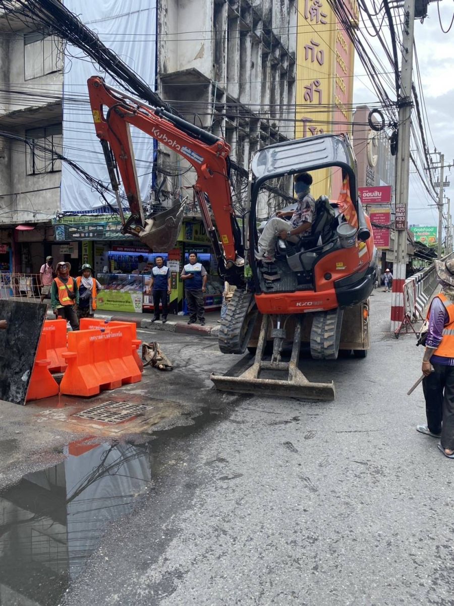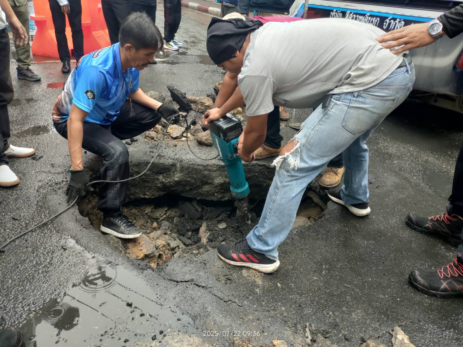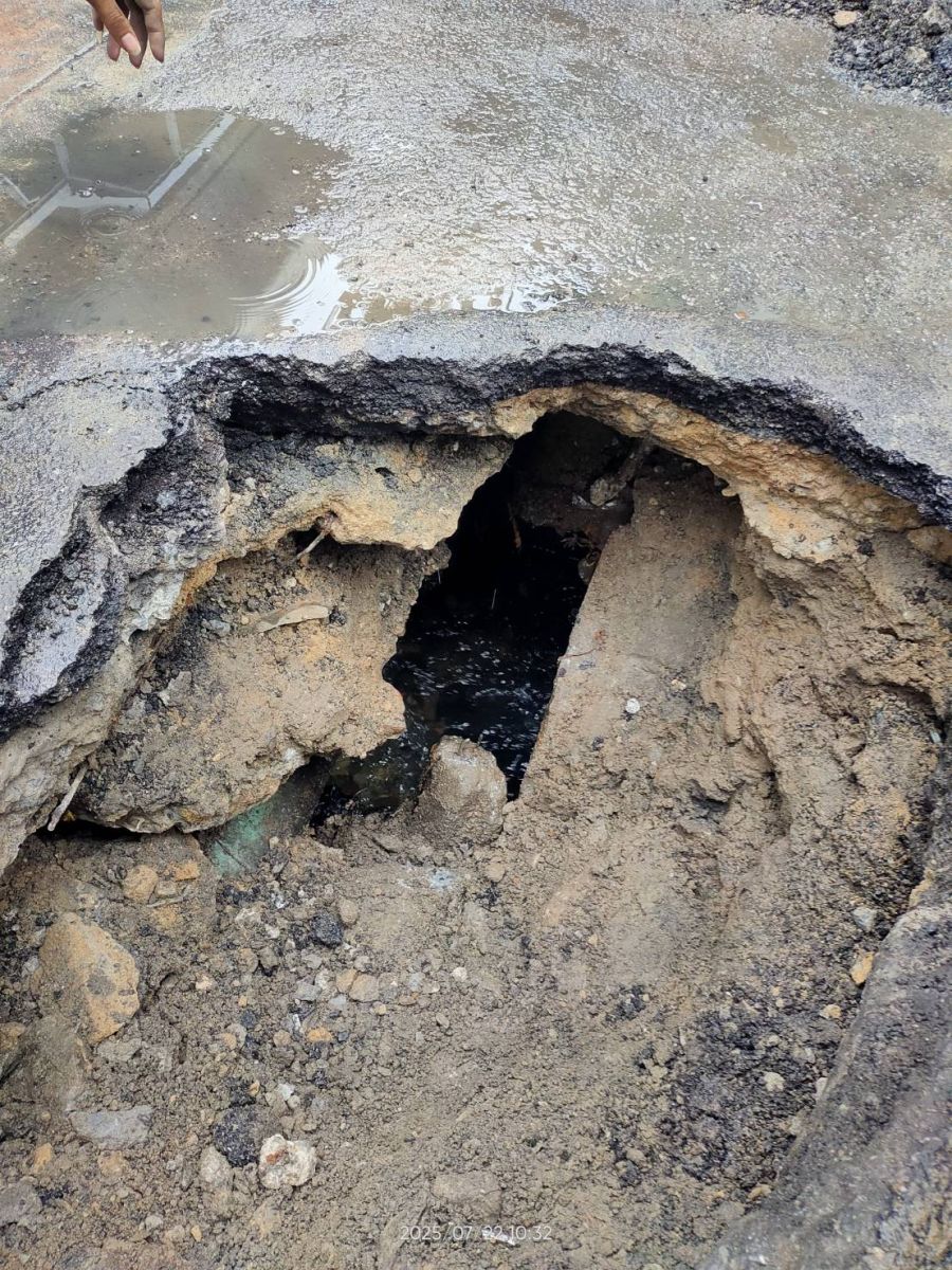 สาเหตุ : เบื้องต้นเกิดจากการกระเซาะของน้ำ ส่งผลให้เกิดโพร่งใต้ผิวการจราจร