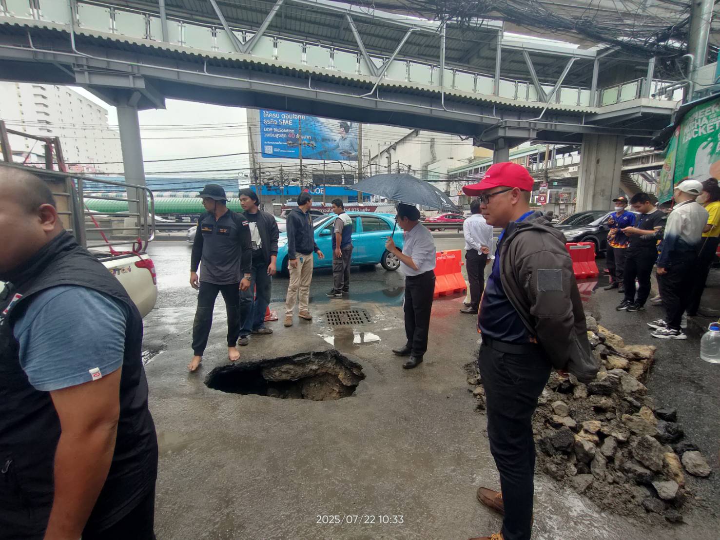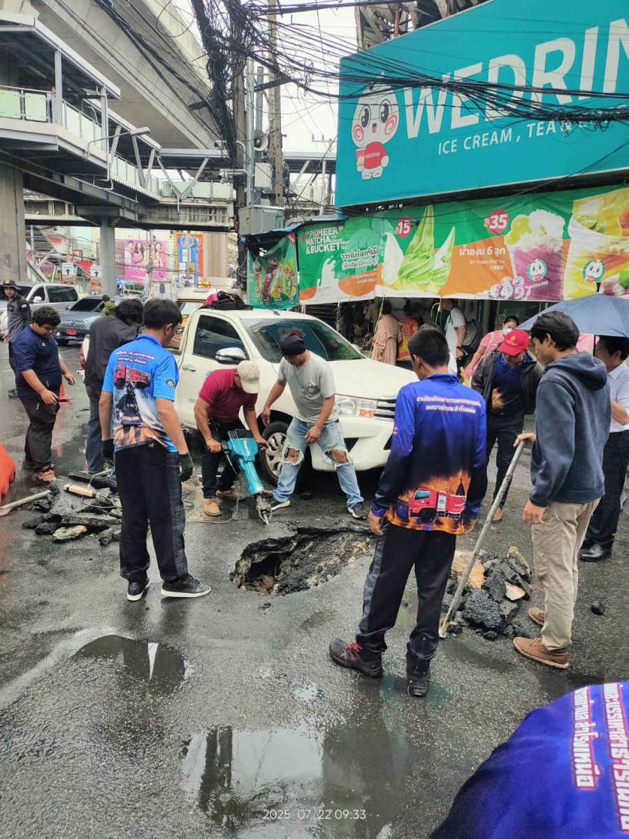 วันที่ 22 ก.ค.2568 งานซ่อมแซมผิวการจราจร กรณี ถนนสุขุมวิท ขาออก เกิดถนนยุบตัว บริเวณ ปากซอยวัดด่านสำโรง ขนาดหลุม : กว้าง 1 ม. ยาว1.50 ม. ลึก 1 ม.