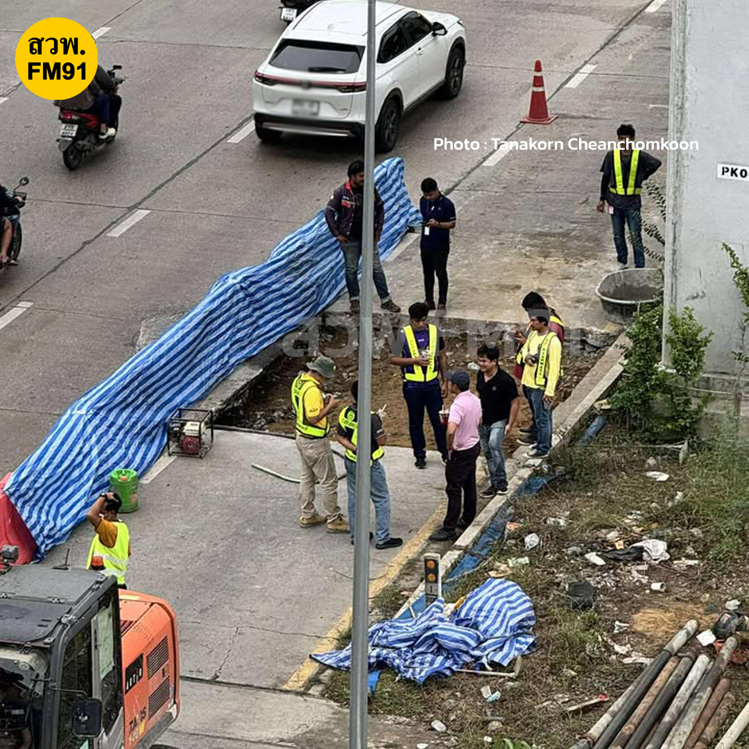 ถนนทรุดตัว! ถ.แจ้งวัฒนะ ขาออก หน้าห้างบิ๊กซี เอ็กซ์ตร้า (เลี่ยงเมืองปากเกร็ด) เลนขวา จนท.ดำเนินการสกัดและซ่อมแซมผิวการจราจรเทปูน ยังไม่สามารถเปิดจราจรได้