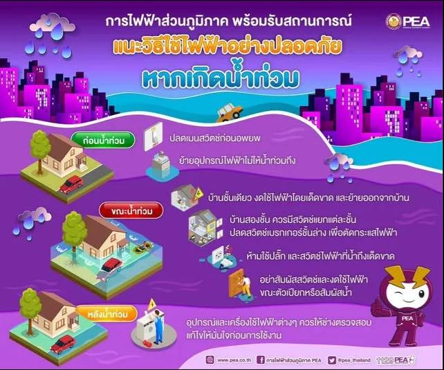 การไฟฟ้าส่วนภูมิภาค (PEA) ขอให้ประชาชนติดตามข่าวสารสภาพอากาศ ประกาศเตือนจากหน่วยงานภาครัฐและหน่วยงานที่เกี่ยวข้องอย่างใกล้ชิด เพื่อเตรียมพร้อมรับสถานการณ์น้ำท่วมทุกขณะ PEA มีข้อแนะนำประชาชนเกี่ยวกับการใช้ไฟฟ้า กรณีเกิดน้ำท่วมหรือน้ำท่วมขัง เพื่อความปลอดภัย ดังนี้