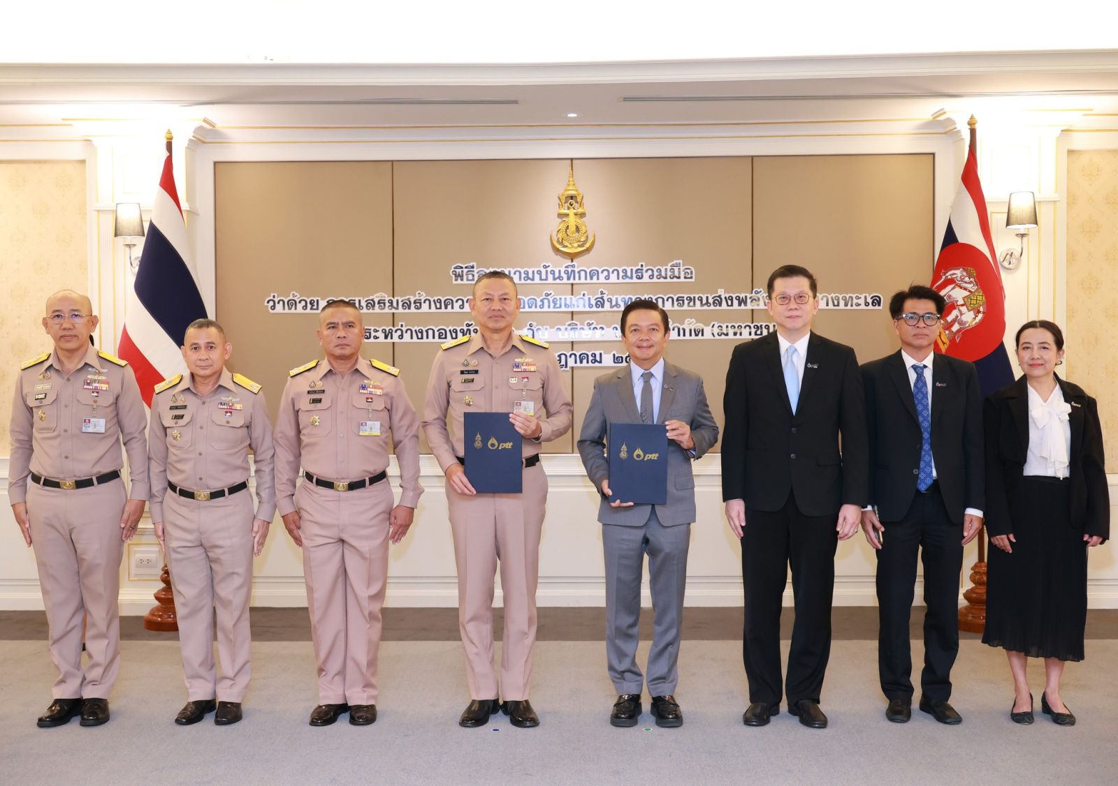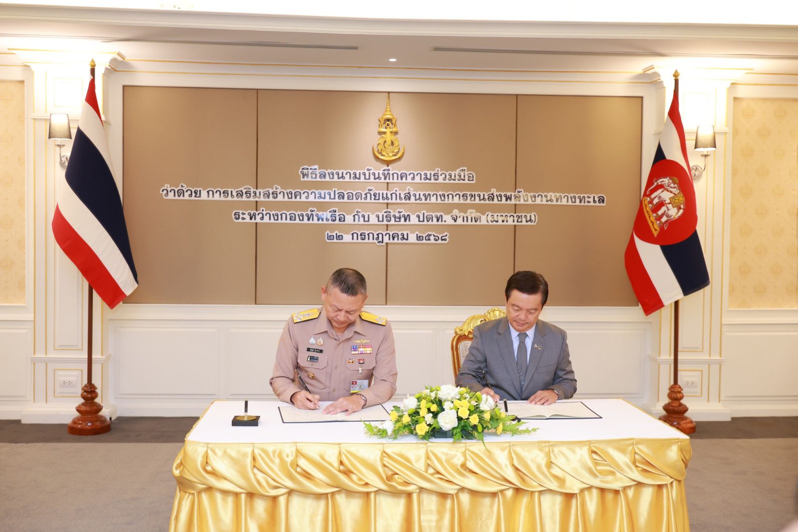 วันนี้ 22 ก.ค. 2568 – พลเรือเอก จิรพล ว่องวิทย์ ผู้บัญชาการทหารเรือ (ซ้าย) และ ดร.คงกระพัน อินทรแจ้ง ประธานเจ้าหน้าที่บริหารและกรรมการผู้จัดการใหญ่ บริษัท ปตท. จำกัด (มหาชน) (ปตท.) (ขวา) ร่วมลงนามในบันทึกความร่วมมือว่าด้วย การเสริมสร้างความปลอดภัยแก่เส้นทางการขนส่งพลังงานทางทะเล ระหว่างกองทัพเรือ และ บริษัท ปตท. จำกัด (มหาชน) เพื่อร่วมพัฒนาและส่งเสริมกลไกการประสานงานที่เกี่ยวข้องกับการรักษาความปลอดภัยแก่เส้นทางการขนส่งพลังงานทางทะเล ครอบคลุมเส้นทางนำเข้าและส่งออกของประเทศ โดยมุ่งเน้นการรวบรวมและแลกเปลี่ยนข้อมูลข่าวสารระหว่างกองทัพเรือและ ปตท. รวมถึงหน่วยงานราชการและภาคเอกชนอื่นๆ ที่เกี่ยวข้องอย่างรวดเร็วและมีประสิทธิภาพ พร้อมทั้งวิเคราะห์และประเมินสถานการณ์ที่อาจส่งผลกระทบต่อเส้นทางการขนส่ง นับเป็นอีกก้าวสำคัญในการยกระดับมาตรการรักษาความปลอดภัยด้านพลังงานทางทะเล เสริมศักยภาพพันธกิจในการรักษาความมั่นคงทางพลังงานของประเทศอย่างยั่งยืน