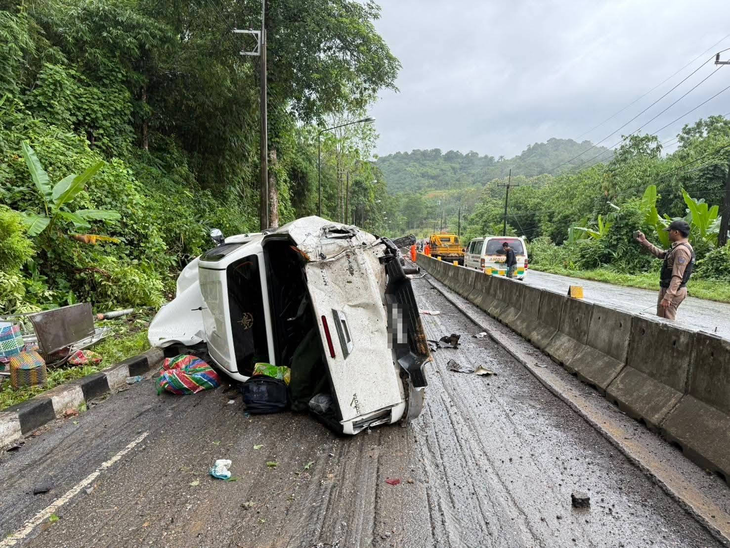 อุบัติเหตุหมู่มีผู้เสียชีวิต รถบรรทุกชนกับรถกระบะ ช่วงทางโค้งลงเขา ถนนสายทองผาภูมิ - สังขละบุรี จ.กาญจนบุรี