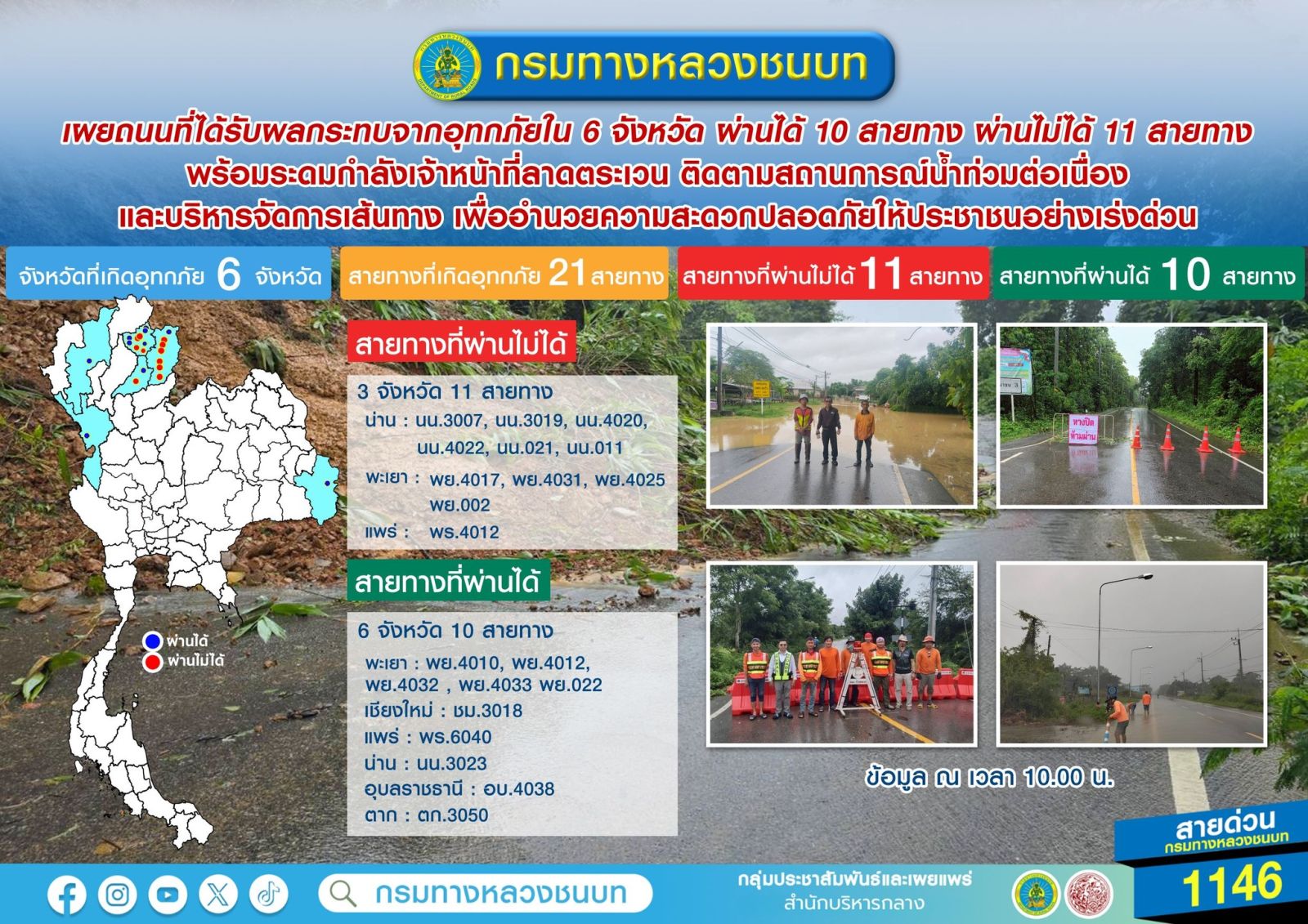 กรมทางหลวงชนบท เผยถนนที่ได้รับผลกระทบจากอุทกภัยใน 6 จังหวัด ผ่านได้ 10 สายทาง ผ่านไม่ได้ 11 สายทาง พร้อมระดมกำลังเจ้าหน้าที่ลาดตระเวน ติดตามสถานการณ์น้ำท่วมต่อเนื่อง และบริหารจัดการเส้นทาง เพื่ออำนวยความสะดวกปลอดภัยให้ประชาชนอย่างเร่งด่วน