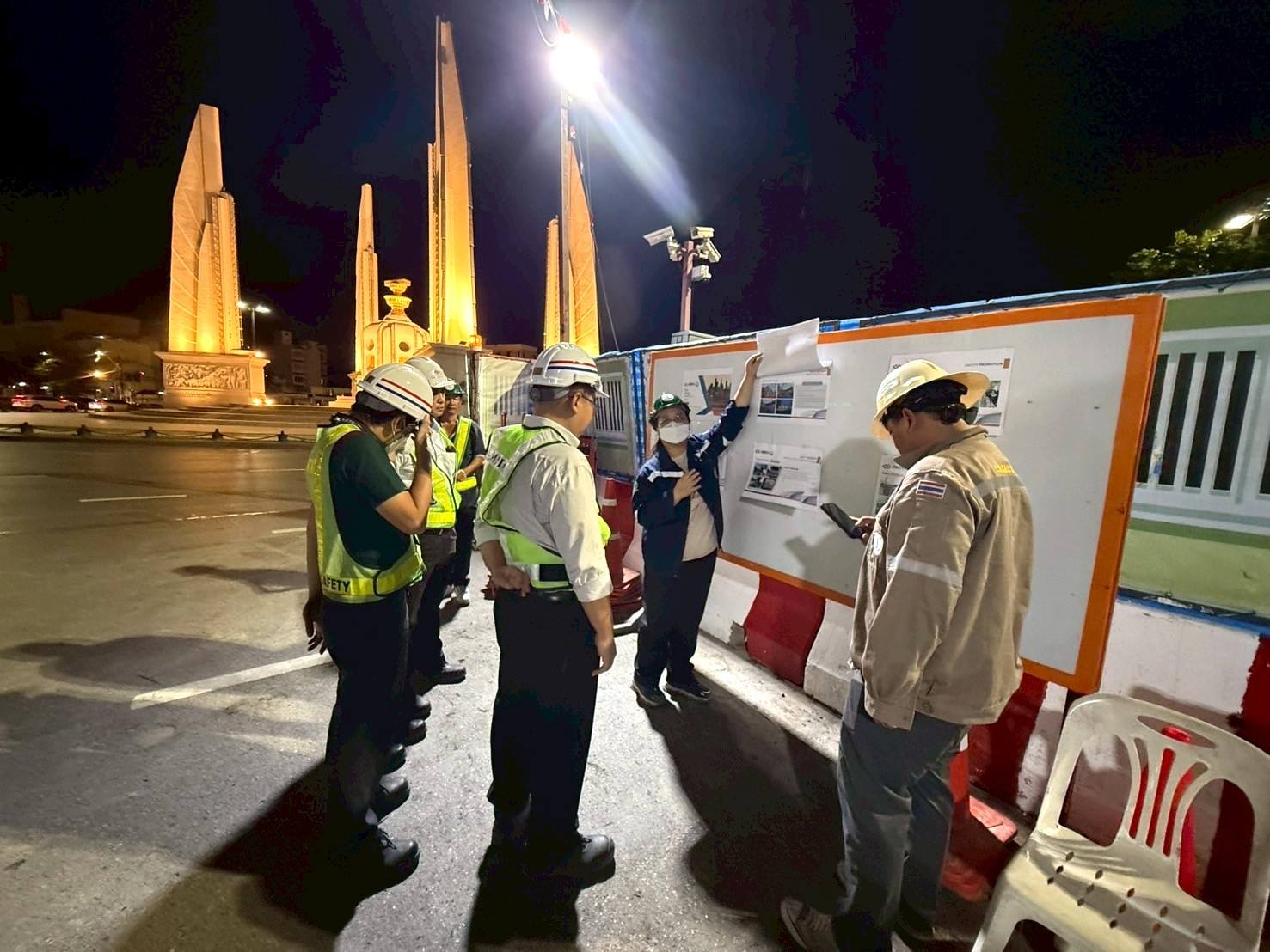 การรถไฟฟ้าขนส่งมวลชนแห่งประเทศไทย (รฟม.) โดยสำนักงานความปลอดภัย อาชีวอนามัยและสภาพแวดล้อมในการทำงาน (สปอ.) ลงพื้นที่ตรวจสอบการดำเนินงานด้านความปลอดภัยในการก่อสร้าง โครงการรถไฟฟ้าสายสีส้ม ช่วงบางขุนนนท์ – มีนบุรี (สุวินทวงศ์) ช่วงเวลากลางคืน (Night Audit)