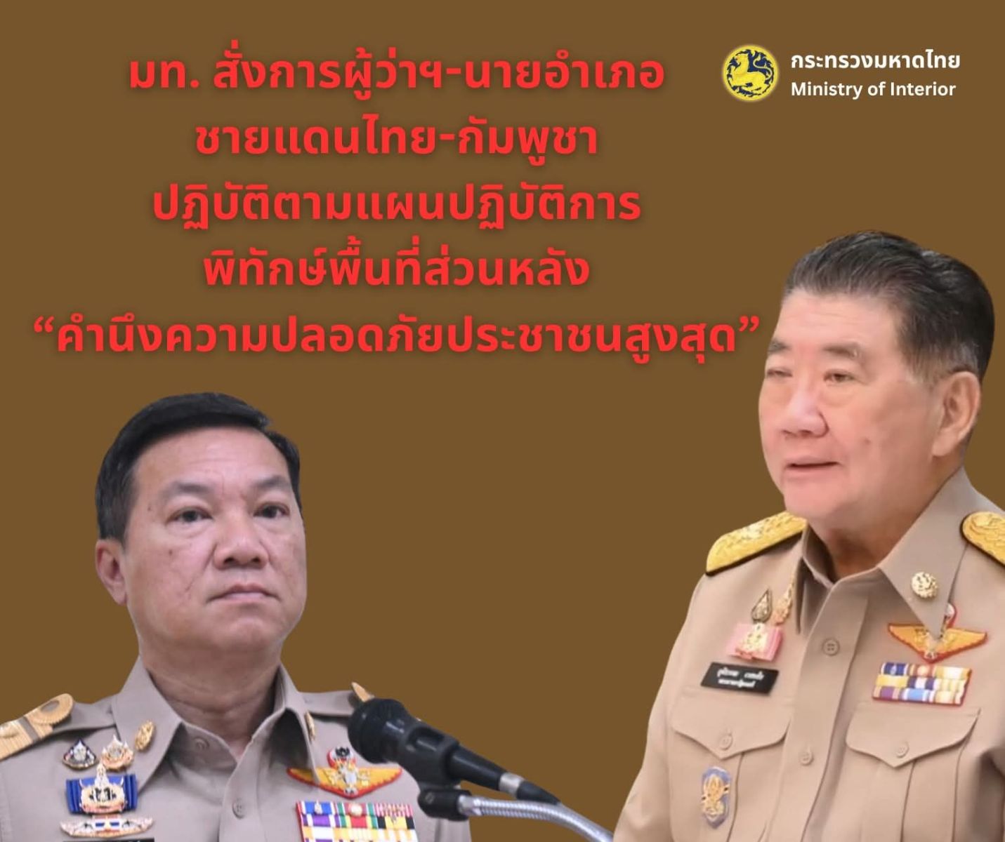 ปลัด มท.เผยผู้ว่าฯ สุรินทร์ ศรีสะเกษ อุบลฯ บุรีรัมย์ อพยพประชาชนแล้ว พร้อมสั่งการ ผู้ว่าฯ – นายอำเภอชายแดนไทย-กัมพูชา ภาคตะวันออก เตรียมอพยพประชาชนหากสถานการณ์ลุกลาม และปฏิบัติตามแผนปฏิบัติการพิทักษ์พื้นที่ส่วนหลัง โดย “คำนึงถึงความปลอดภัยของประชาชนเป็นสิ่งสำคัญที่สุด”