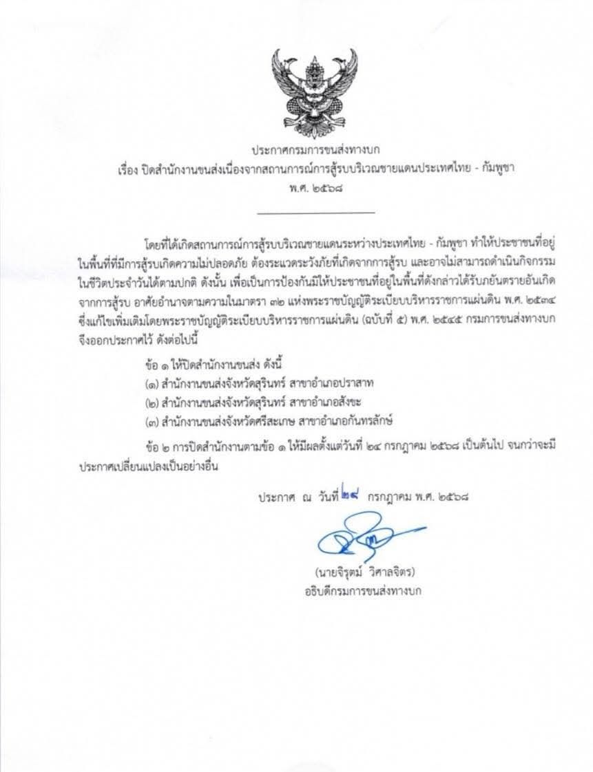 ประกาศกรมการขนส่งทางบก เรื่อง ปิดสำนักงานขนส่งเนื่องจากสถานการณ์การสู้รบบริเวณชายแดนประเทศไทย - กัมพูชา พ.ศ. 2568