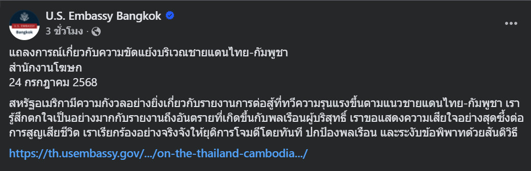 วันนี้ (25 ก.ค.68) สถานเอกอัครราชทูสหรัฐอเมริกาประจำประเทศไทย ออกแถลงการณ์เกี่ยวกับความขัดแย้งบริเวณชายแดนไทย-กัมพูชา ระบุว่า สหรัฐอเมริกามีความกังวลอย่างยิ่งเกี่ยวกับรายงานการต่อสู้ที่ทวีความรุนแรงขึ้นตามแนวชายแดนไทย-กัมพูชา เรารู้สึกตกใจเป็นอย่างมากกับรายงานถึงอันตรายที่เกิดขึ้นกับพลเรือนผู้บริสุทธิ์