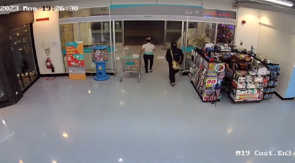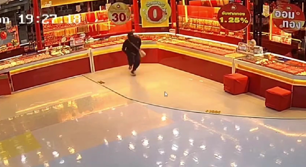 คนร้ายจึงสบโอกาส ปีนขึ้นเคาน์เตอร์ทองหน้าร้าน กวาดสร้อยคอทองคำน้ำหนัก 1 บาท ที่ตู้ประมาณ 40 กว่าเส้น มูลค่ากว่า 1 ล้านบาท แล้วปีนเคาน์เตอร์วิ่งหนีออกทางหลังห้าง ปีนกำแพงด้านหลังห้างหลบหนีเข้าไปอย่างรวดเร็ว