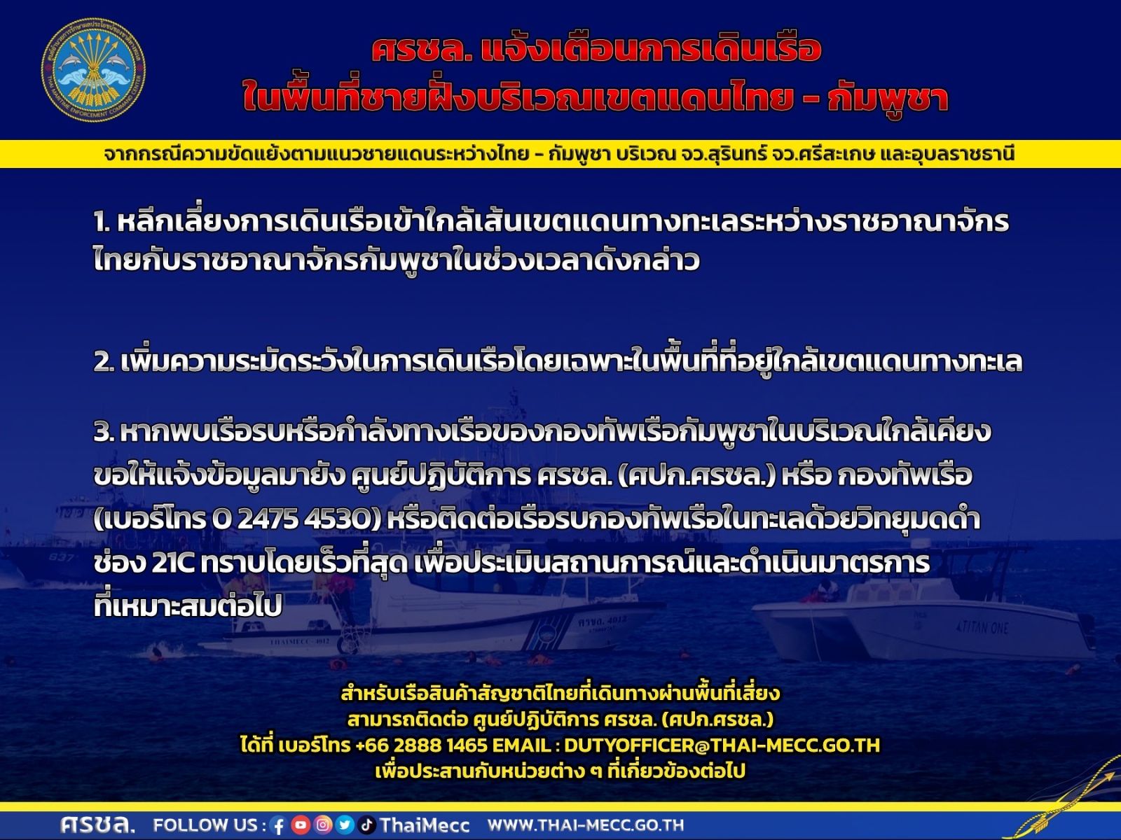 25 ก.ค. 2568 ศรชล. แจ้งเตือนการเดินเรือในพื้นที่ชายฝั่งบริเวณเขตแดนไทย - กัมพูชา