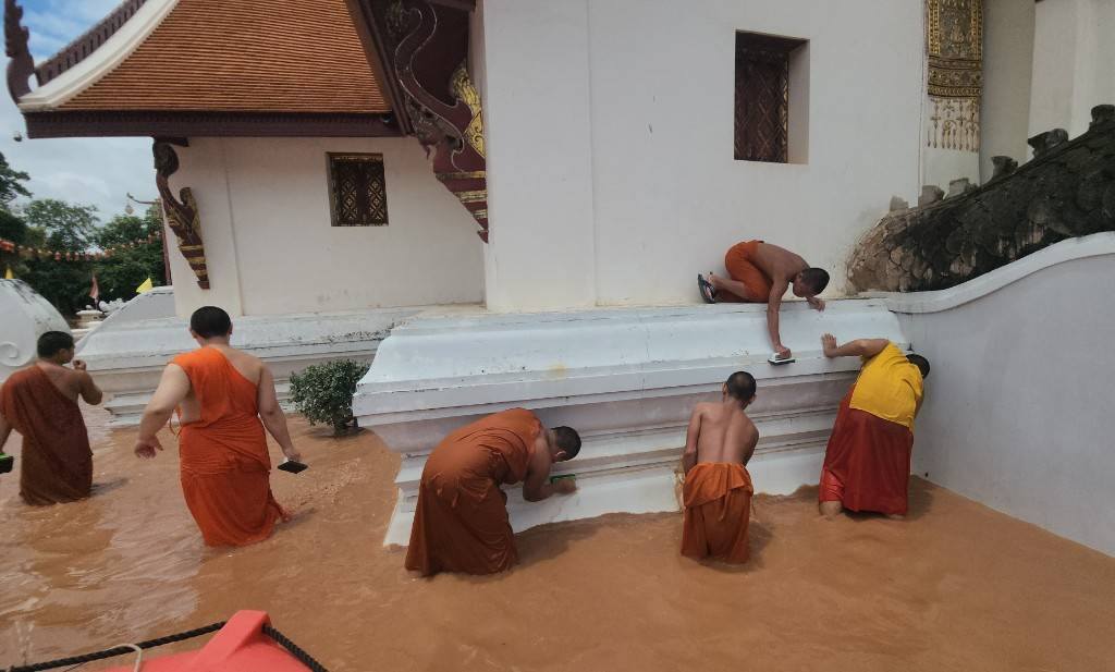 แม้เช้าวันนี้ฝนจะหยุดตก และระดับน้ำเริ่มลดลงเพียงเล็กน้อย แต่พระสงฆ์ต้องลุยน้ำออกสำรวจความเสียหาย โดยเฉพาะบริเวณพระอุโบสถ ที่ภายในมีจิตรกรรมฝาผนัง “ปู่ม่านย่าม่าน กระซิบรักบันลือโลก” อันล้ำค่า