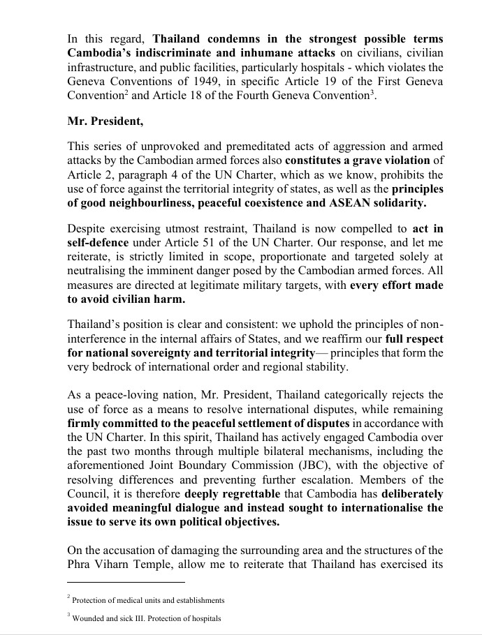 แม้จะมีความอดทนอย่างที่สุด ประเทศไทยก็ถูกบังคับให้ต้อง กระทำเพื่อป้องกันตนเองภายใต้มาตรา 51 ของกฎบัตรสหประชาชาติ การตอบสนองของเราถูกจำกัดอย่างเคร่งครัดในขอบเขต ได้สัดส่วน และมุ่งเป้าไปที่การทำให้ภัยคุกคามที่กำลังจะเกิดขึ้นจากกองกำลังกัมพูชาเป็นกลางเท่านั้น มาตรการทั้งหมดมุ่งเป้าไปที่เป้าหมายทางทหารที่ชอบด้วยกฎหมาย โดยมีความพยายามทุกวิถีทางเพื่อหลีกเลี่ยงการทำร้ายพลเรือน