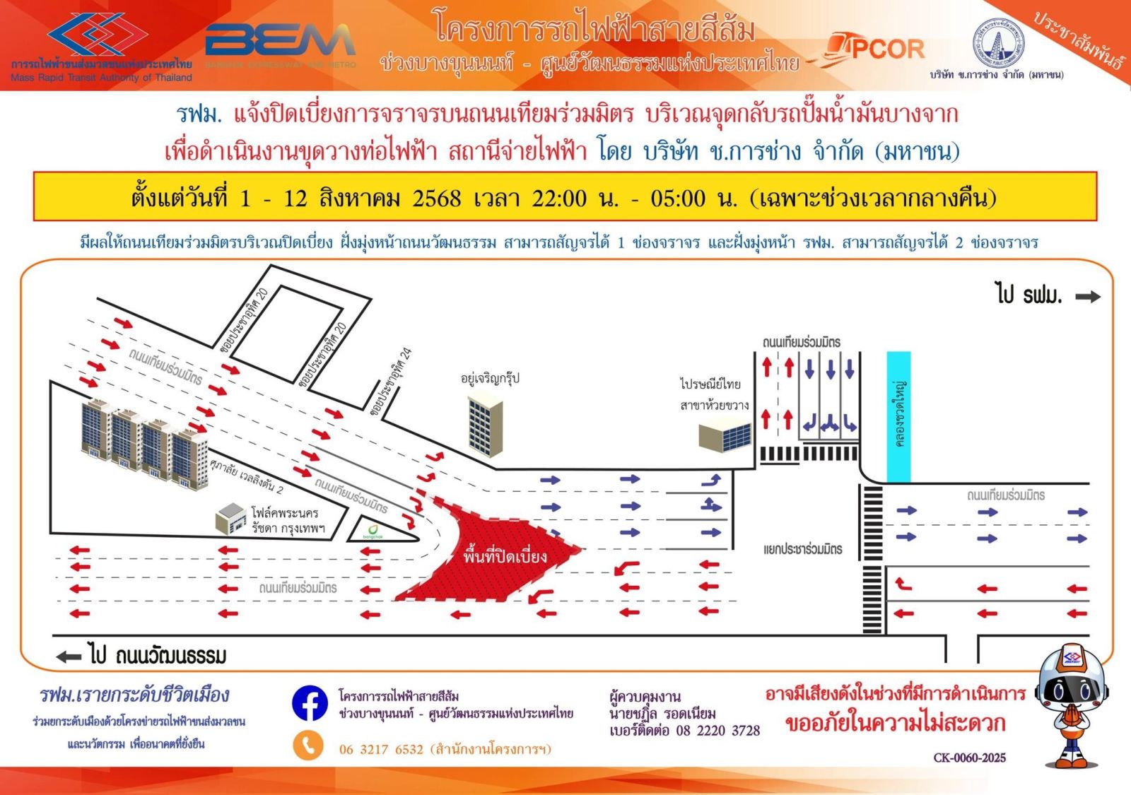 การรถไฟฟ้าขนส่งมวลชนแห่งประเทศไทย (รฟม.) แจ้งว่า บริษัท ช.การช่าง จำกัด (มหาชน) ผู้รับจ้างออกแบบและก่อสร้างอุโมงค์ทางวิ่งและสถานีใต้ดิน โครงการรถไฟฟ้าสายสีส้ม ช่วงบางขุนนนท์ – ศูนย์วัฒนธรรมแห่งประเทศไทย มีความจำเป็นต้องปิดเบี่ยงการจราจร 4 ช่องจราจร บนถนนเทียมร่วมมิตร บริเวณจุดกลับรถปั๊มน้ำมันบางจาก เพื่อดำเนินงานขุดวางท่อไฟฟ้า สถานีจ่ายไฟฟ้า ตั้งแต่วันที่ 1 – 12 สิงหาคม 2568 เวลา 22:00 น. – 05:00 น. (เฉพาะช่วงเวลากลางคืน) มีผลให้ถนนเทียมร่วมมิตรบริเวณปิดเบี่ยง ฝั่งมุ่งหน้าถนนวัฒนธรรม สามารถสัญจรได้ 1 ช่องจราจร และฝั่งมุ่งหน้า รฟม. สามารถสัญจรได้ 2 ช่องจราจร โดยประชาชนสามารถเข้า – ออกที่พักอาศัยได้ตามปกติ