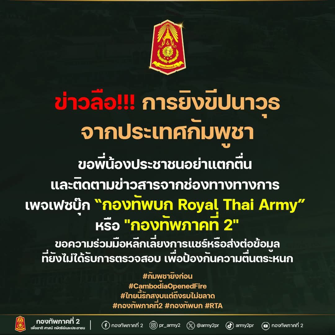 กองทัพภาคที่ 2 ชี้แจงกรณีข่าวลือการยิงขีปนาวุธจากประเทศกัมพูชา