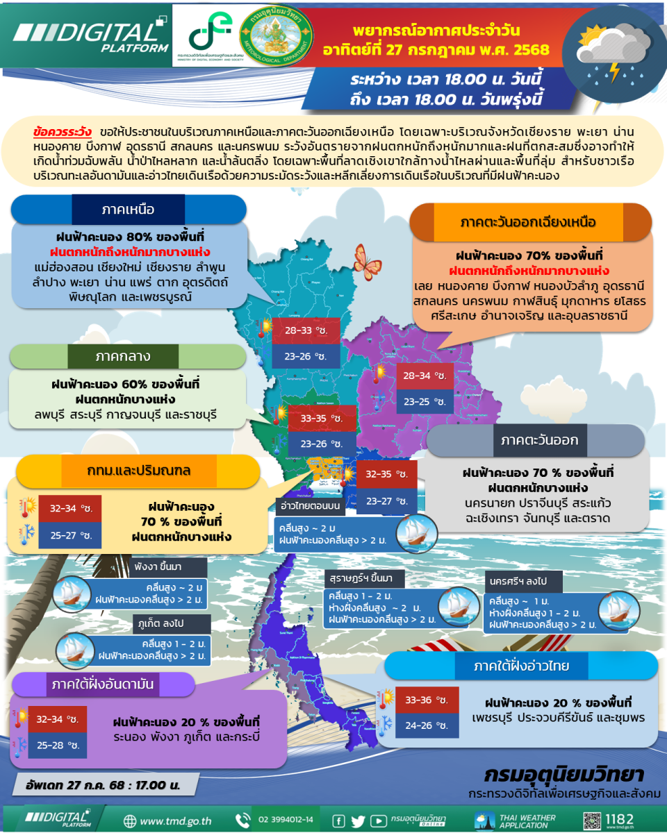 ลักษณะอากาศทั่วไป วันที่ 28 กรกฎาคม 2568 พยากรณ์อากาศ 24 ชั่วโมงข้างหน้า ประเทศไทยตอนบนยังคงมีฝนตกหนักบางแห่ง และมีฝนตกหนักมากบางพื้นที่ในภาคเหนือและภาคตะวันออกเฉียงเหนือ โดยเฉพาะบริเวณจังหวัดเชียงราย พะเยา น่าน หนองคาย บึงกาฬ อุดรธานี สกลนคร และนครพนม ขอให้ประชาชนในบริเวณดังกล่าวระวังอันตรายจากฝนตกหนักถึงหนักมากและฝนที่ตกสะสมซึ่งอาจทำให้เกิดน้ำท่วมฉับพลัน น้ำป่าไหลหลาก และน้ำล้นตลิ่ง โดยเฉพาะพื้นที่ลาดเชิงเขาใกล้ทางน้ำไหลผ่านและพื้นที่ลุ่ม