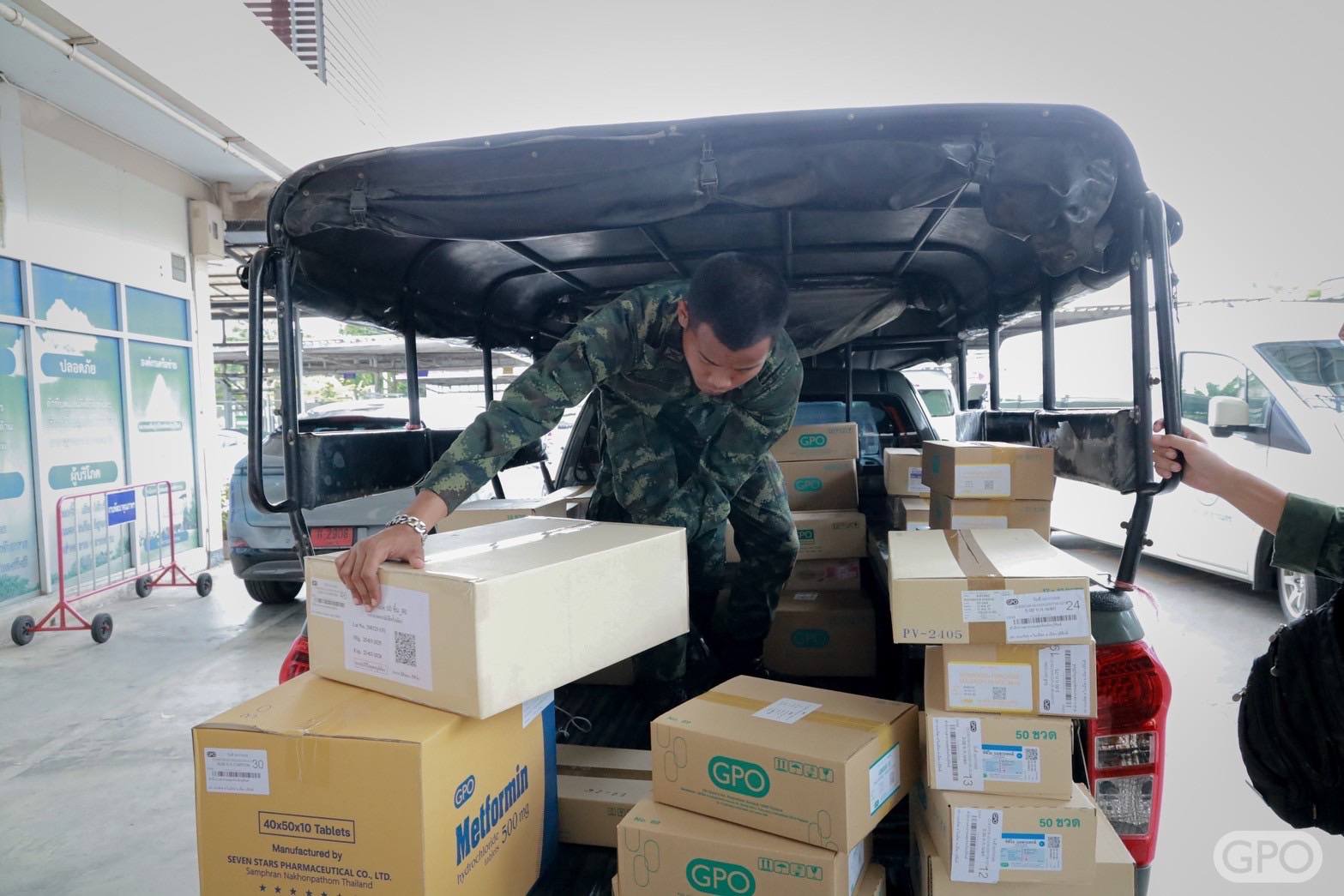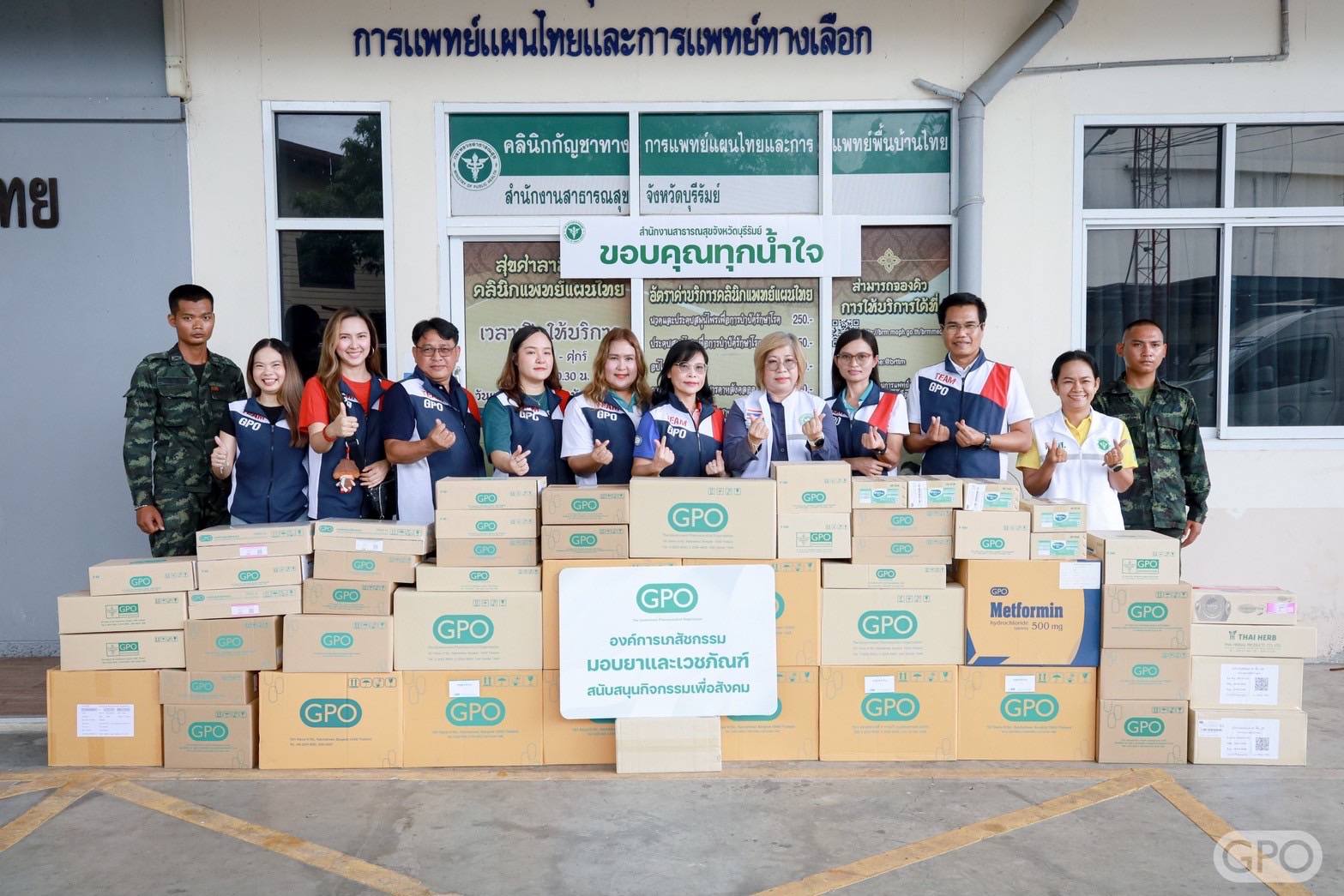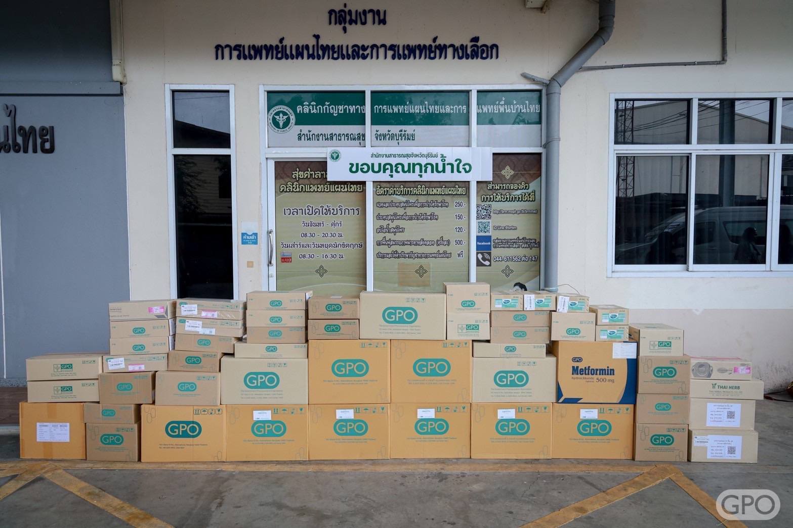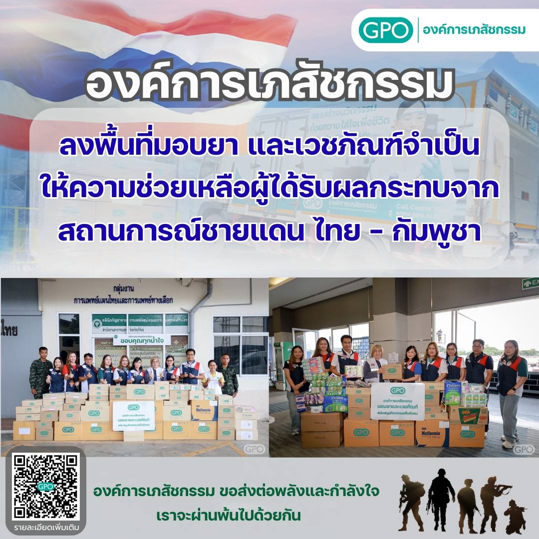 โดยได้ดำเนินการจัดส่งไปยังพื้นที่ที่ได้รับผลกระทบผ่านสำนักงานสาธารณสุขจังหวัด(สสจ.) ได้แก่สสจ.บุรีรัมย์ ศูนย์ช่วยเหลือผู้อพยพจังหวัดบุรีรัมย์ สสจ.ศรีสะเกษ สสจ.สุรินทร์ และ สสจ.อุบลราชธานี รวมกว่า 40 รายการ อาทิ ยาชุดประจำบ้าน, ยารักษากลุ่มโรคเรื้อรัง (NCD), ยาช่วยชีวิต, ยารักษาโรคอื่นๆที่จำเป็น เช่น แก้ปวดลดไข้ โรคกระเพาะ ทางเดินหายใจ รักษาแผล รวมถึงเวชภัณฑ์และกลุ่มผลิตภัณฑ์สมุนไพรอื่นๆ เป็นต้น รวมมูลค่า 5 แสนบาท