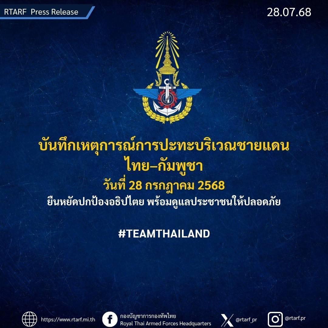 กองทัพไทยขอยืนยันว่าจะปฏิบัติหน้าที่ด้วยความเข้มแข็งและเสียสละ เพื่อปกป้องอธิปไตยของชาติและความปลอดภัยของประชาชนชาวไทยอย่างถึงที่สุด