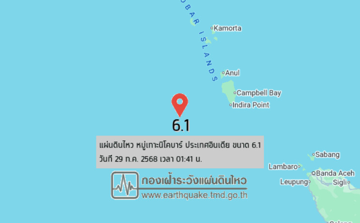 วันที่ 29 ก.ค. 2568 เวลา 01.41 น. กองเฝ้าระวังแผ่นดินไหว กรมอุตุนิยมวิทยา แจ้งว่า เกิดเหตุ แผ่นดินไหว ขนาด 6.1 ความลึก 10 กม. บริเวณพื้นที่ หมู่เกาะนิโคบาร์ ประเทศอินเดีย (6.55°N,92.90°E) ศูนย์กลางห่างออกไปทางทิศตะวันตกเฉียงใต้ของ อ.เมือง จ.ภูเก็ต ประมาณ 623 กม. ขณะนี้ยังไม่มีรายงานผลกระทบต่อประเทศไทย