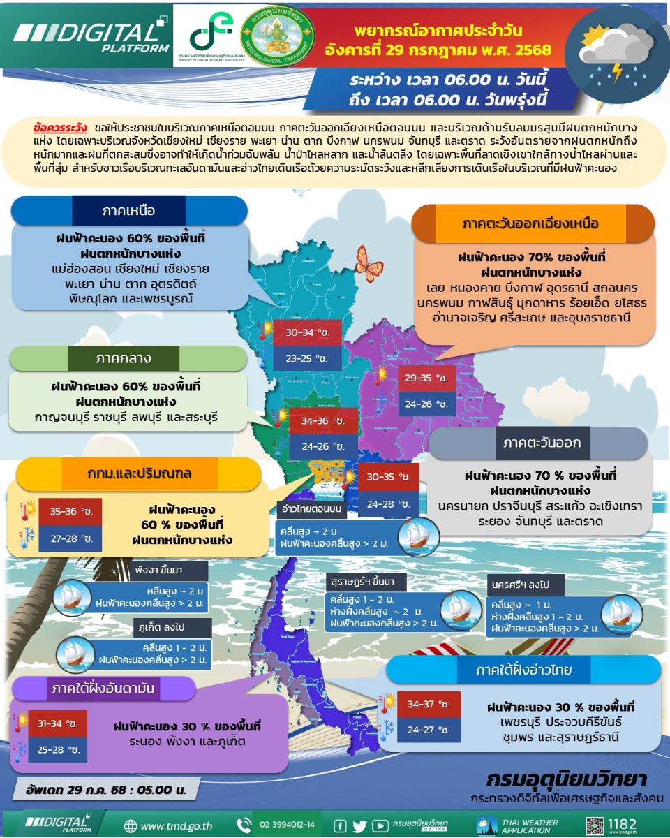ลักษณะอากาศทั่วไป วันที่ 29 กรกฎาคม 2568 พยากรณ์อากาศ 24 ชั่วโมงข้างหน้า ภาคเหนือตอนบน ภาคตะวันออกเฉียงเหนือตอนบน และบริเวณด้านรับลมมรสุมมีฝนตกหนักบางแห่ง โดยเฉพาะบริเวณจังหวัดเชียงใหม่ เชียงราย พะเยา น่าน ตาก บึงกาฬ นครพนม จันทบุรี และตราด ขอให้ประชาชนในบริเวณดังกล่าวระวังอันตรายจากฝนตกหนักและฝนที่ตกสะสมซึ่งอาจทำให้เกิดน้ำท่วมฉับพลัน น้ำป่าไหลหลาก และน้ำล้นตลิ่งโดยเฉพาะพื้นที่ลาดเชิงเขาใกล้ทางน้ำไหลผ่านและพื้นที่ลุ่ม