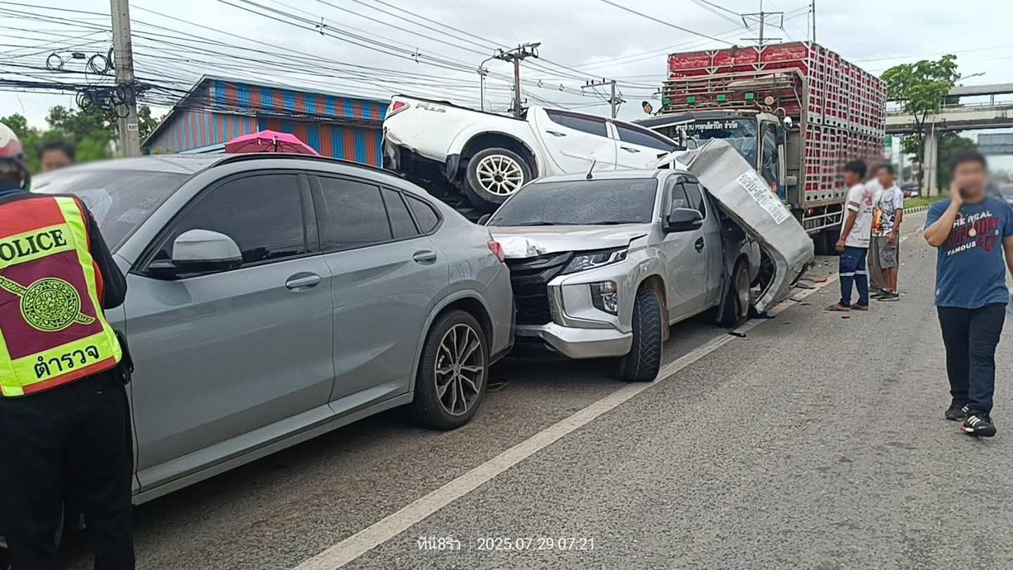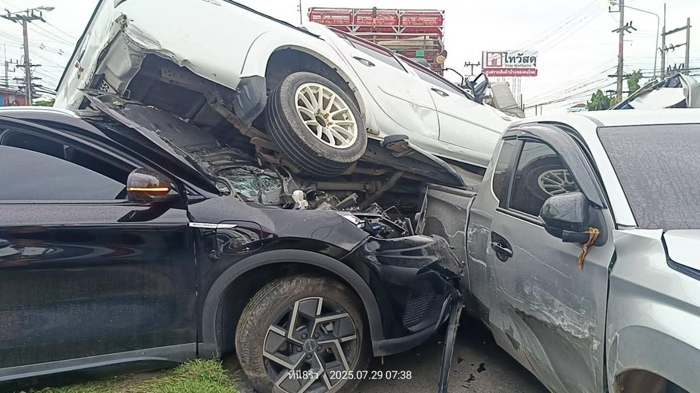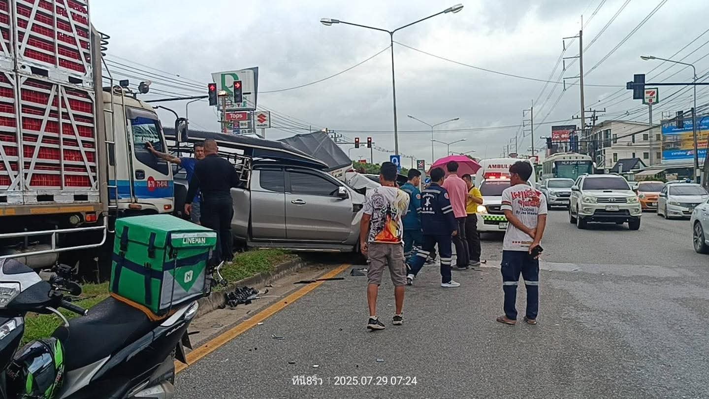 08.38 น. #อุบัติเหตุ เหตุเกิดเมื่อเวลา 07.20 น. ที่ผ่านมา ถนนสิริโสธร กลางแยกไฟแดงเทศบาล 2 ใกล้เคียงหน้าห้างโรบินสันฉะเชิงเทรา รถนั่งส่วนบุคคล , รถกระบะ และ รถบรรทุก 10 ล้อ ชนกัน 7 คัน กีดขวางจราจรเลนกลางและเลนขวา จราจรติดขัด