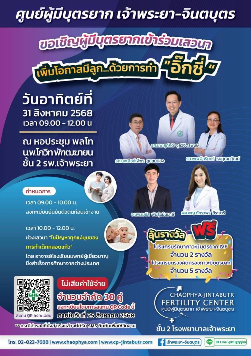 ศูนย์ผู้มีบุตรยาก เจ้าพระยา-จินตบุตร ขอเชิญผู้มีบุตรยากเข้าร่วมเสวนาได้โดยไม่เสียค่าใช้จ่าย เพิ่มโอกาสมีลูก...ด้วยการทำ"อิ๊กซี่"
