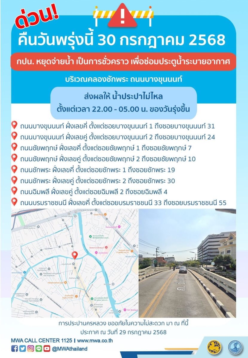 การประปานครหลวง (กปน.) ขอแจ้งให้ทราบว่า จะดำเนินการซ่อมประตูน้ำระบายอากาศ ในพื้นที่บริเวณคลองชักพระ ถนนบางขุนนนท์ เพื่อให้ประชาชนได้รับบริการน้ำประปาอย่างเพียงพอและทั่วถึง จึงมีความจำเป็นต้องหยุดจ่ายน้ำ เป็นการชั่วคราว ในคืนวันพรุ่งนี้ (วันพุธที่ 30 กรกฎาคม 2568) ตั้งแต่เวลา 22.00 - 05.00 น. ของวันรุ่งขึ้น โดยระหว่างดำเนินการ ส่งผลให้ น้ำประปาไม่ไหล ในพื้นที่ดังต่อไปนี้