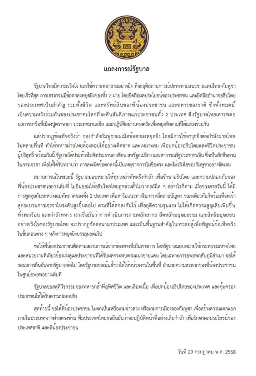 รัฐบาลไทยมีความจริงใจ และใช้ความพยายามอย่างยิ่ง ที่จะยุติสถานการณ์ปะทะตามแนวชายแดนไทย-กัมพูชา โดยเร็วที่สุด การเจรจาจนมีข้อตกลงหยุดยิงของทั้ง 2 ฝ่าย โดยยึดถือผลประโยชน์ของประชาชน และยึดถืออํานาจอธิปไตย ของประเทศเป็นสําคัญ รวมทั้งชีวิต และทรัพย์สินของพี่น้องประชาชน และทหารของชาติ ซึ่งทั้งหมดนี้ เป็นความหวังร่วมกันของประชาคมโลกที่จะคืนสันติภาพแก่ประชาชนทั้ง 2 ประเทศ ซึ่งรัฐบาลไทยเคารพต่อ ผลการหารือที่เมืองปุตราจายา ประเทศมาเลเซีย และปฏิบัติอย่างเคร่งครัดเพื่อหยุดยิงตามที่ได้แถลงร่วมกัน