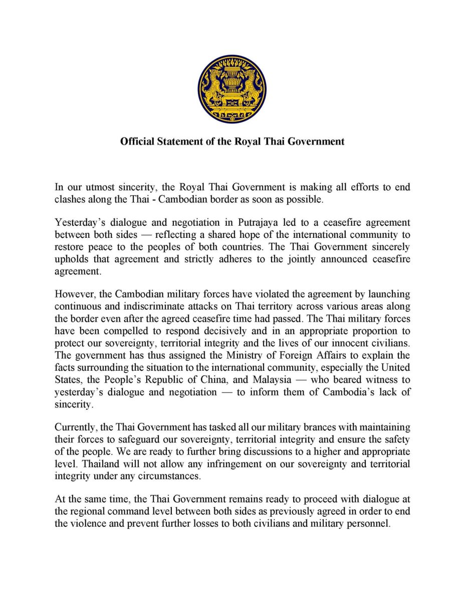Yesterday's dialogue and negotiation in Putrajaya led to a ceasefire agreement between both sides reflecting a shared hope of the international community to restore peace to the peoples of both countries. The Thai Government sincerely upholds that agreement and strictly adheres to the jointly announced ceasefire agreement.