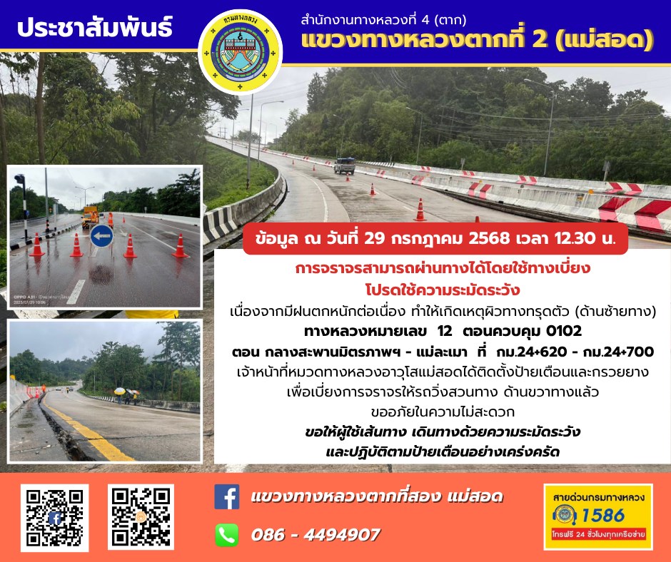 29 ก.ค.2568 แขวงทางหลวงตากที่ 2 (แม่สอด) ได้รับรายงานจากหมวดทางหลวงอาวุโสแม่สอด เนื่องจากมีฝนตกหนักต่อเนื่อง ทำให้เกิดผิวทางทรุดตัว บนทางหลวงหมายเลข 12 ตอนควบคุม 0100 ตอน กลางสะพานมิตรภาพที่แม่สอด (เขตแดนไทย/พม่า) - แม่ละเมา ระหว่าง กม.24+620 - กม.24+700 ส่งผลให้ในขณะนี้เส้นทางดังกล่าวต้องใช้เส้นทางเบี่ยงในการสัญจร
