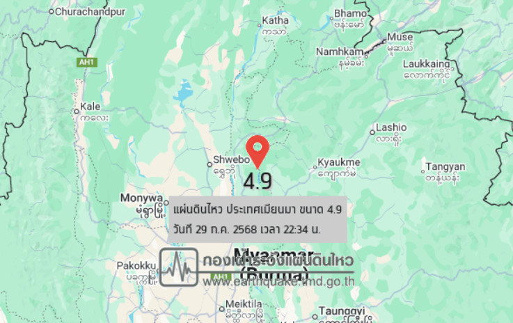 เวลา 22.34 น. กองเฝ้าระวังแผ่นดินไหว กรมอุตุนิยมวิทยา แจ้งเหตุ แผ่นดินไหว ขนาด 4.9 ความลึก 10 กม. บริเวณพื้นที่ของประเทศเมียนมา (22.52°N,96.31°E) ศูนย์กลางห่างออกไปทางทิศตะวันตกเฉียงเหนือของ อ.ปางมะผ้า จ.แม่ฮ่องสอน ประมาณ 389 กม. ยังไม่มีผลกระทบต่อประเทศไทย