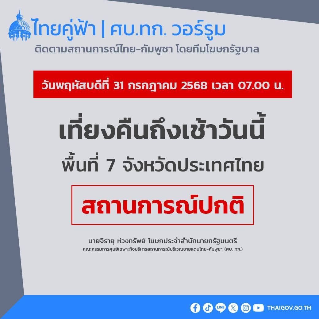 วันนี้ (31 ก.ค.68) เวลา 07.00 น. นายจิรายุ ห่วงทรัพย์ โฆษกประจำสำนักนายกรัฐมนตรี คณะกรรมการศูนย์เฉพาะกิจบริหารสถานการณ์ชายแดนไทย–กัมพูชา (ศบ.ทก.) เปิดเผยว่า ตั้งแต่ช่วงดึกของเมื่อคืนที่ผ่านมา วันพุธ 30 กรกฎาคม 68 ตั้งแต่ 21.00 น. จนถึงช่วงเช้า เวลา 07.00 น.วันนี้ ยังไม่มีรายงานเหตุการณ์รุนแรงใด ๆ ที่เกิดขึ้นตามแนวชายแดนไทย ในทุกพื้นที่ 7 จังหวัดชายแดน