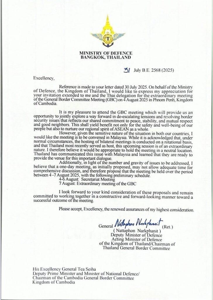วันที่ 31 กรกฎาคม 2568 ภายหลัง พล.อ.เตีย เซยฮา รองนายกฯ และ รมว.กลาโหม กัมพูชา ได้ส่งเอกสารถึง พล.อ.ณัฐพล นาคพาณิชย์ รมช.กลาโหมของไทย เชิญร่วมประชุมคณะกรรมการชายแดนทั่วไป (GBC) โดยระบุว่า ข้าพเจ้าขอแสดงความเคารพและขอเรียนให้ทราบว่า รองนายกรัฐมนตรีและรัฐมนตรีว่าการกระทรวงกลาโหมของกัมพูชา ได้มีจดหมายเชิญถึง พลเอกณัฐพล นาคพาณิชย์ รักษาการรัฐมนตรีว่าการกระทรวงกลาโหมของไทย การประชุมพิเศษของคณะกรรมการชายแดนทั่วไป (GBC) ซึ่งจะจัดขึ้นในวันที่ 4 สิงหาคม 2568 ณ กรุงพนมเปญ ประเทศกัมพูชา ข้าพเจ้าจะรู้สึกซาบซึ้งเป็นอย่างยิ่ง หากสำนักงานอันทรงเกียรติของท่านจะกรุณาส่งต่อจดหมายฉบับนี้ไปยังปลายทางโดยเร็วที่สุดเท่าที่จะเป็นไปได้