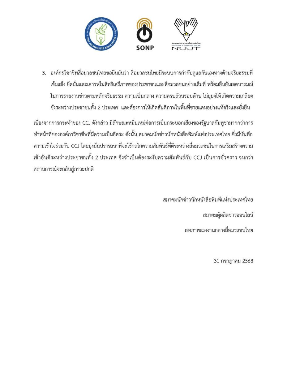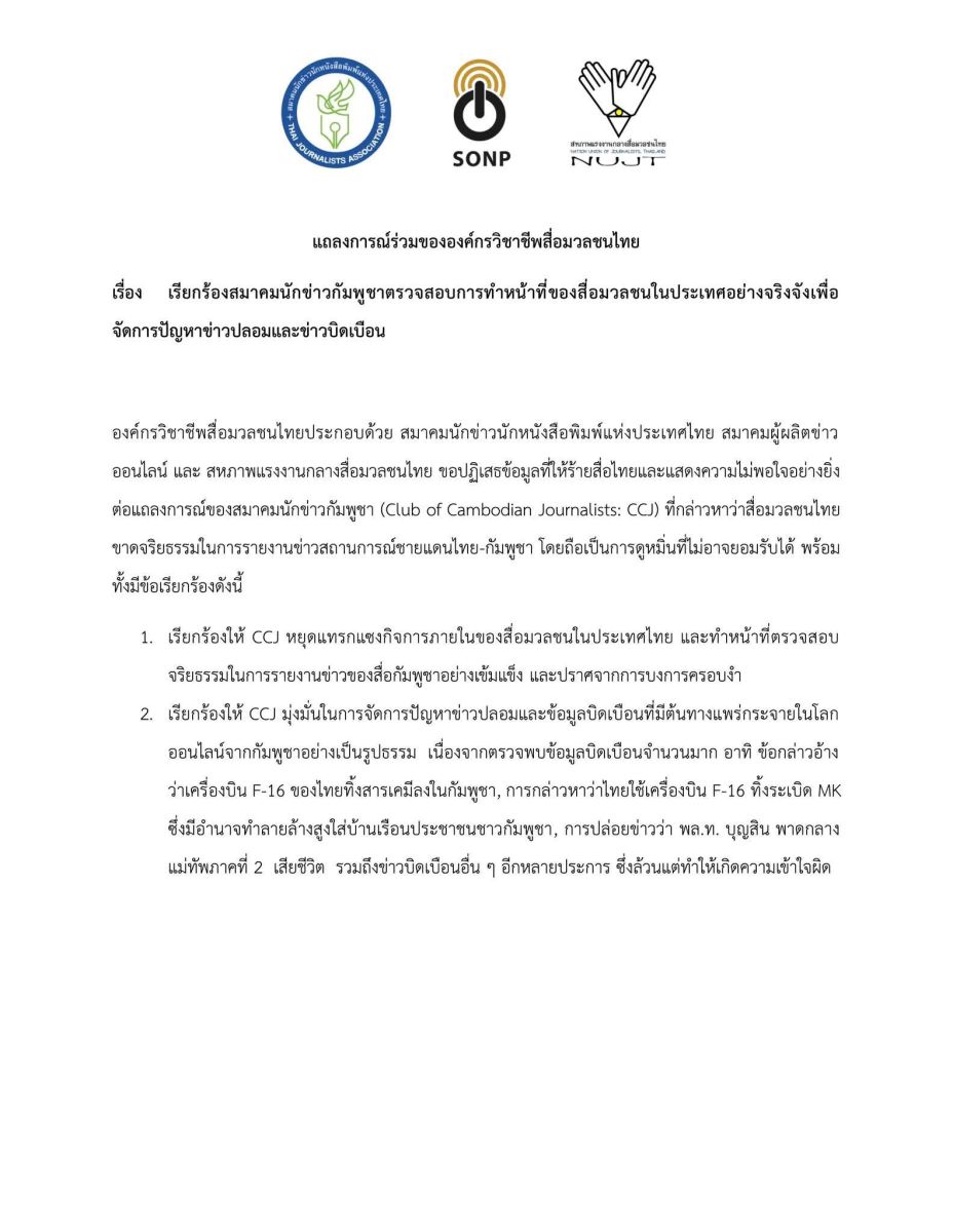 องค์กรวิชาชีพสื่อมวลชนไทยประกอบด้วย สมาคมนักข่าวนักหนังสือพิมพ์แห่งประเทศไทย สมาคมผู้ผลิตข่าวออนไลน์ และ สหภาพแรงงานกลางสื่อมวลชนไทย ขอปฏิเสธข้อมูลที่ให้ร้ายสื่อไทยและแสดงความไม่พอใจอย่างยิ่งต่อแถลงการณ์ของสมาคมนักข่าวกัมพูชา (Club of Cambodian Journalists: CCJ) ที่กล่าวหาว่าสื่อมวลชนไทยขาดจริยธรรมในการรายงานข่าวสถานการณ์ชายแดนไทย-กัมพูชา โดยถือเป็นการดูหมิ่นที่ไม่อาจยอมรับได้ พร้อมทั้งมีข้อเรียกร้องดังนี้