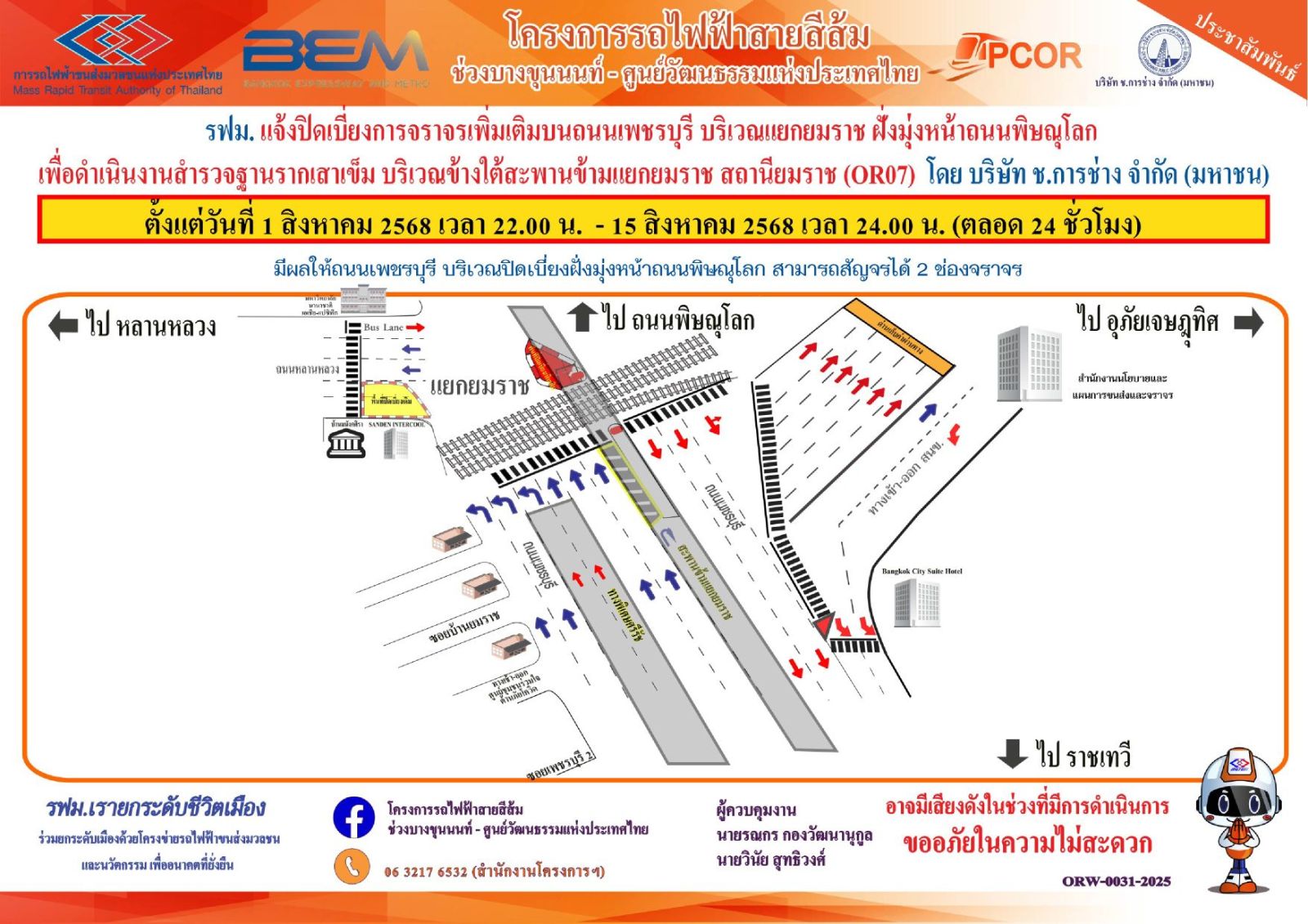 การรถไฟฟ้าขนส่งมวลชนแห่งประเทศไทย (รฟม.) แจ้งว่า บริษัท ช.การช่าง จำกัด (มหาชน) ผู้รับจ้างออกแบบและก่อสร้างอุโมงค์ทางวิ่งและสถานีใต้ดิน โครงการรถไฟฟ้าสายสีส้ม ช่วงบางขุนนนท์ - ศูนย์วัฒนธรรมแห่งประเทศไทย มีความจำเป็นต้องปิดเบี่ยงการจราจรเพิ่มเติม 1 ช่องจราจร บนถนนเพชรบุรี บริเวณแยกยมราช ฝั่งมุ่งหน้าถนนพิษณุโลก เพื่อดำเนินงานสำรวจฐานรากเสาเข็ม บริเวณข้างใต้สะพานข้ามแยกยมราช สถานียมราช (OR07) ตั้งแต่วันที่ 1 สิงหาคม 2568 เวลา 22.00 น. – 15 สิงหาคม 2568 เวลา 24.00 น. (ตลอด 24 ชั่วโมง) มีผลให้ถนนเพชรบุรี บริเวณปิดเบี่ยง ฝั่งมุ่งหน้าถนนพิษณุโลก สามารถสัญจรได้ 2 ช่องจราจร โดยประชาชนสามารถเข้า – ออกที่พักอาศัยได้ตามปกติ