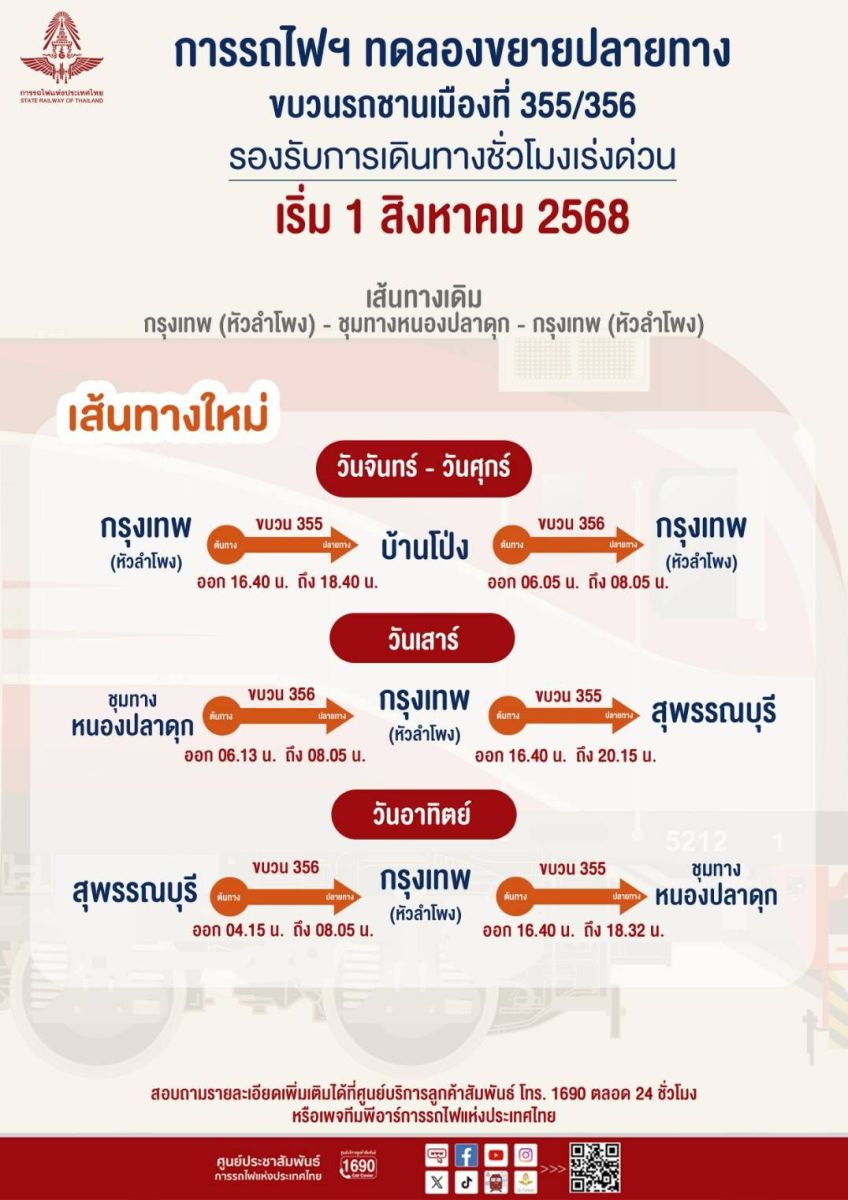 การรถไฟแห่งประเทศไทย (รฟท.) เดินหน้าปรับรูปแบบการให้บริการรถชานเมืองเพื่อเพิ่มความสะดวกให้กับประชาชนในช่วงชั่วโมงเร่งด่วน โดยทดลองขยายปลายทางของขบวนรถชานเมืองที่ 355/356 จากเดิม กรุงเทพ (หัวลำโพง) – ชุมทางหนองปลาดุก – กรุงเทพ (หัวลำโพง) ให้เป็น กรุงเทพ (หัวลำโพง) – บ้านโป่ง – กรุงเทพ (หัวลำโพง) เฉพาะวันจันทร์ถึงวันศุกร์ เริ่มตั้งแต่วันที่ 1 สิงหาคม 2568 เป็นต้นไป เป็นระยะเวลา 3 เดือน โดยมีรายละเอียด ดังนี้