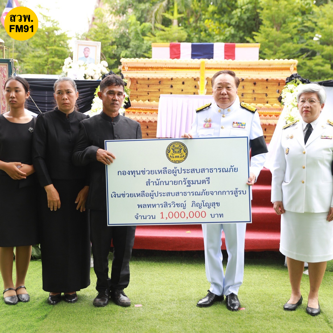 ในโอกาสนี้ นายสุชาติ ตันเจริญ รัฐมนตรีประจำสำนักนายกรัฐมนตรี ผู้แทนรัฐบาล มอบเงินช่วยเหลือผู้ประสบสาธารณภัยจากการสู้รบจากเหตุปะทะชายแดนไทย-กัมพูชา ให้แก่ครอบครัวพลทหารสิรวิชญ์ ภิญโญสุข จำนวน 1,000,000 บาท พร้อมทั้งกล่าวให้กำลังใจครอบครัว และขอบคุณความเสียสละของพลทหารสิรวิชญ์