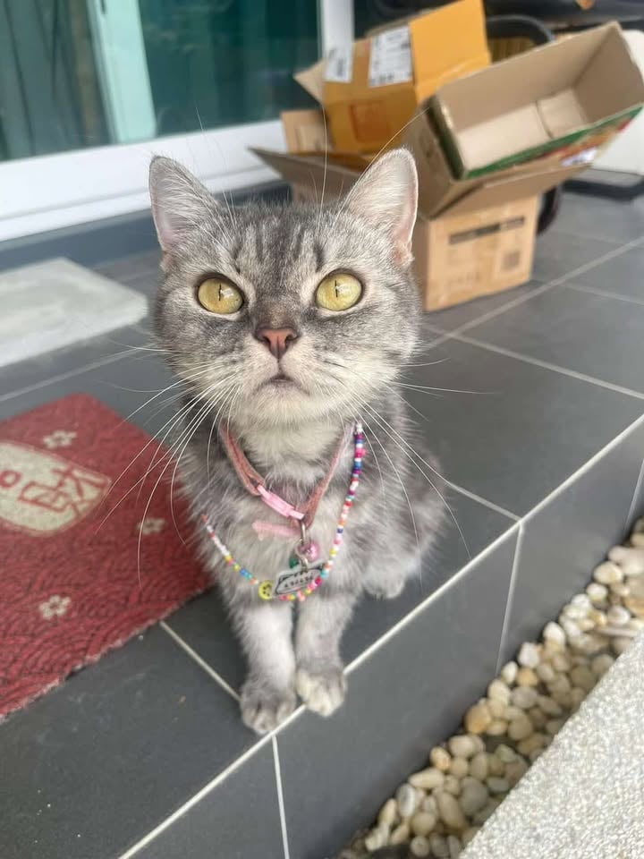 คุณสุทธอร ฝากตามหาย แมว ชื่อ "เนเน่" สีขาวเทา พันธุ์อเมริกันช็อตแฮร์ เพศเมีย อายุ 7 ขวบ ทำหมันเรียบร้อยแล้ว สวมปลอกคอสีกรมท่า มีชื่อและเบอร์โทรติดอยู่