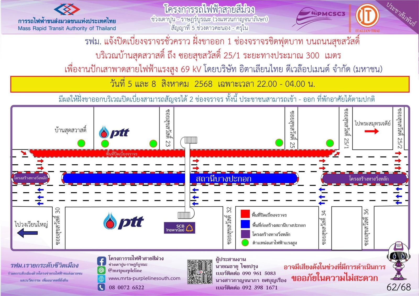 การรถไฟฟ้าขนส่งมวลชนแห่งประเทศไทย (รฟม.) แจ้งว่า บริษัท อิตาเลียนไทย ดีเวล๊อปเมนต์ จำกัด (มหาชน) ผู้รับจ้างงานก่อสร้างทางวิ่งและสถานียกระดับ อาคารจอดรถไฟฟ้าและอาคารจอดแล้วจร โครงการรถไฟฟ้าสายสีม่วง ช่วงเตาปูน - ราษฎร์บูรณะ (วงแหวนกาญจนาภิเษก) สัญญาที่ 5 ช่วงดาวคะนอง - ครุใน มีความจำเป็นต้องปิดเบี่ยงจราจรชั่วคราว ฝั่งขาออก 1 ช่องจราจร ชิดฟุตบาท บนถนนสุขสวัสดิ์ บริเวณบ้านสุดสวาสดิ์ ถึง ซอยสุขสวัสดิ์ 25/1 ระยะทางประมาณ 300 เมตร เพื่องานปักเสาพาดสายไฟฟ้าแรงสูง 69 kV ในวันที่ 5 และ 8 สิงหาคม 2568 เฉพาะเวลา 22.00 - 04.00 น. มีผลให้ฝั่งขาออกบริเวณปิดเบี่ยง สามารถสัญจรได้ 2 ช่องจราจร ทั้งนี้ประชาชนสามารถเข้า-ออก ที่พักอาศัยได้ตามปกติ