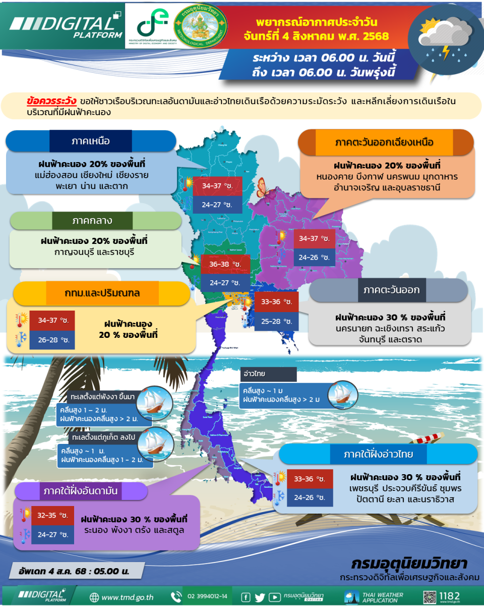 ลักษณะอากาศทั่วไป วันที่ 4 สิงหาคม 2568 พยากรณ์อากาศ 24 ชั่วโมงข้างหน้า ประเทศไทยตอนบนมีฝนน้อย เนื่องจากมรสุมตะวันตกเฉียงใต้กำลังอ่อนยังคงพัดปกคลุมทะเลอันดามัน ประเทศไทย และอ่าวไทย ในขณะที่มีหย่อมความกดอากาศต่ำปกคลุมบริเวณประเทศเวียดนามตอนบน