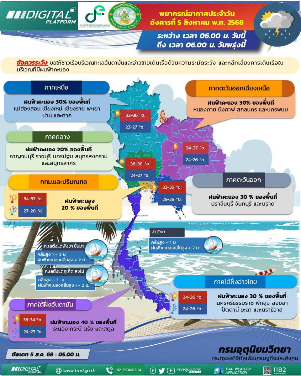 ลักษณะอากาศทั่วไป วันที่ 5 สิงหาคม 2568 พยากรณ์อากาศ 24 ชั่วโมงข้างหน้า ประเทศไทยตอนบนมีฝนฟ้าคะนองบางแห่ง เนื่องจากมรสุมตะวันตกเฉียงใต้กำลังอ่อนยังคงพัดปกคลุมทะเลอันดามัน ประเทศไทย และอ่าวไทย ในขณะที่มีหย่อมความกดอากาศต่ำปกคลุมบริเวณประเทศเวียดนามตอนบน