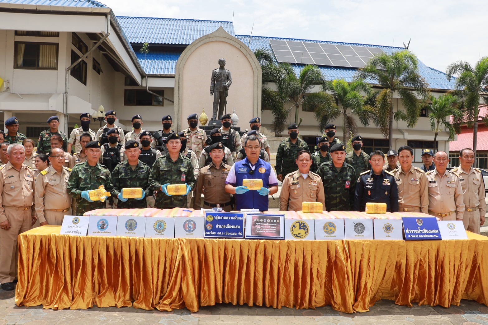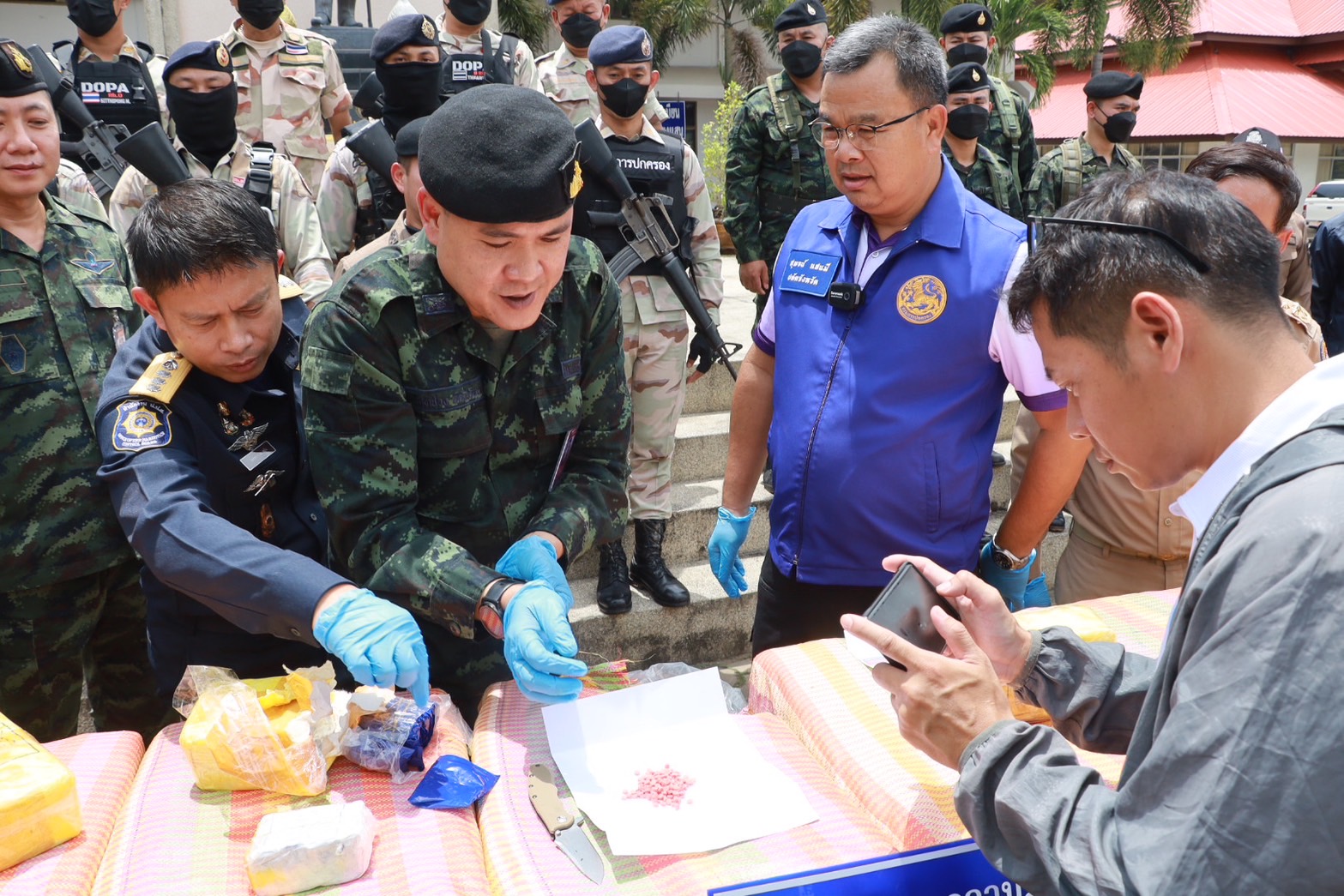 เวลา 13.30 น. วันที่ 5 สิงหาคม 2568 ณ ลานหน้าที่ว่าการอำเภอเชียงแสน จังหวัดเชียงราย นายชรินทร์ ทองสุข ผู้ว่าราชการจังหวัดเชียงราย มอบหมายให้นายสุพจน์ แสนมี ปลัดจังหวัดเชียงราย พันเอกกิตติ นาใจ รองผู้บังคับหน่วยเฉพาะกิจทัพเจ้าตาก กองกำลังผาเมือง นายคฑาสิทธิ์ เนื่องหล้า นายอำเภอเชียงแสน พันตำรวจเอกอนุพันธ์ กันถารัตน์ ผู้กำกับการสถานีตำรวจภูธรเชียงแสน ฝ่ายปกครอง และหน่วยงานที่เกี่ยวข้อง ร่วมกันแถลงข่าวการสกัดกั้นการลำเลียงยาบ้าจำนวนประมาณ 2,500,000 เม็ด
